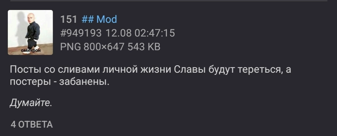 В августе в первую очередь бесконечным сделали тред из-за неадекватной скорости постинга, треды плодились из-за сисунь и топили другие треды. Временная модерация явно по просьбе славяна это другое, её нет уже. Да и бля, даже оригинальный пост с карасиком не удалён. А вот то, что именно он договорился о бесконечном, это просто теория. Абу запросто мог по своей инициативе это устроить тк тут модеров нет и чистить никто это говно не хочет