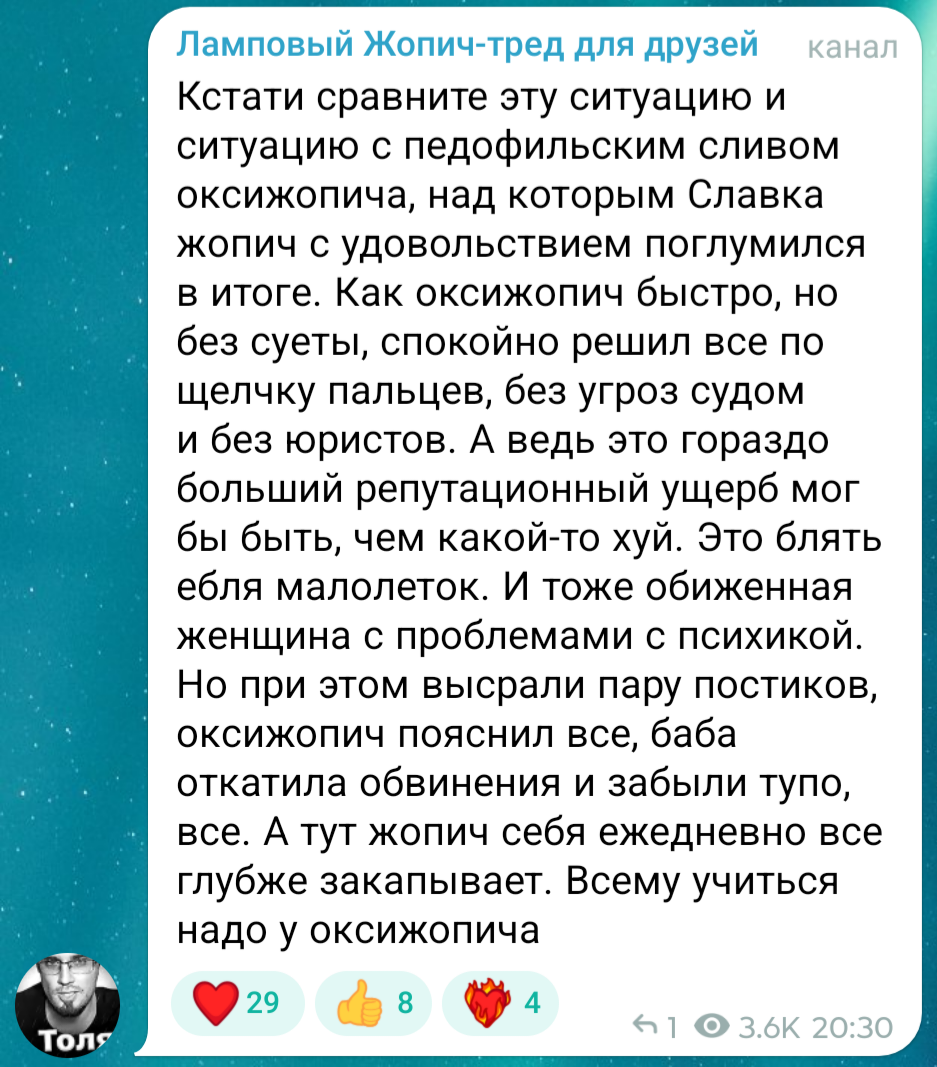 >>1022735 Это мои малышки подписчицы, они под моей протекцией, пусть пишут, а если серьезно, то мне пофиг, я никого не баню и не буду, каждый может писать там в коментах что угодно и обсуждать что хочет, я сам даже не всегда читаю, что там люди в коментах обсуждают, ну пусть пишут малютки, наши сладенькие сисуни, там свобода слова, все могут обсуждать что хотят, хоть Оксижопича и его НЛОшку, хоть сосущего Витьку, хоть терпение Толи, никого банить не буду, а так всех люблю, мои чюваки!!<333