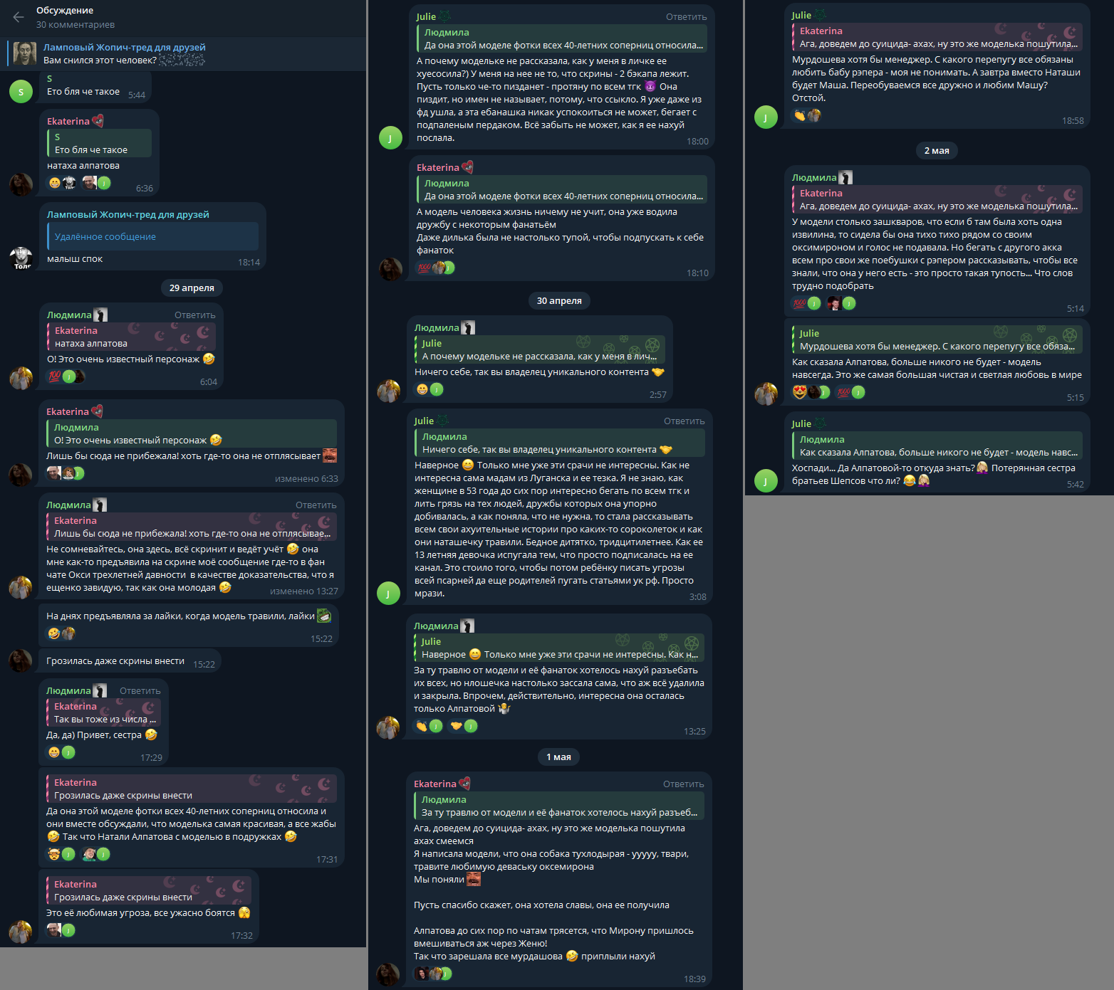 >>1021538 Каждый раз блядь одно и тоже. Специально для этого отельный тред создали для сис. Никто никогда не травил Айшу за отношения с Гнойным. Она слила, что вебкамщица сама, после того, как Гнойный от нее загасился. Рассчитывала, что если «из-за него» она подвергнется травле, то из чувства вины он снова с ней будет. Она специально перестает пить таблетки, чтобы оправдывать психозами свое поведение. Два года она просто засирала Куромышь, даже не трогая Гнойного особо, хотя ее никто не трогал, о ней просто забывали и она снова приходила с новой порцией калтента. Все сливы когда либо существовавшие она устроила сама. Она фиксировалась не на одном только Гнойном, все просто сбегали от нее под утро, она задержался на несколько недель в отношениях с ней. Теперь он ее «наркотик» и она постоянно раздувает драму на почве своей большой любви. При этом она заебывала так же его родственников, судя по перепискам с просьбами отстать. Никто никогда ее не трогал, никто о ней даже на двачах не вспоминал до 3 гейта. То что ее уволили с работы - так она психически больная вебкамщица, которая работала с детьми. >>1021184 Хотела бы такую учительницу своим детям? Она прямо работая в школе нюдсами торговала. Почитай в ее треде как она пробирались в тусовку, чтобы на хуй Гнойного прыгнуть, как интересно можно использовать такого человека. Так же она довела, по своим же словам, чела до самовыпила, чего и надеялась добиться разрушив то, чем Гнойный дорожит - его отношачи, своими сливами. Не веришь на слово - в ее треде есть видосы, где она это говорит. И в тусовке она записывала медиек на диктофон,еще обвиняла в изнасиловании в своем психозе кента Бульвара Депо. Не знаю, что там она терпела, но сочувствия ноль вызывает этот персонаж, она явно хотела заполучить себе Гнойного, как статусную вещь и спонсора, а когда он сорвался с крючка начала месть, потому что ее эго не выдержало отвержения.