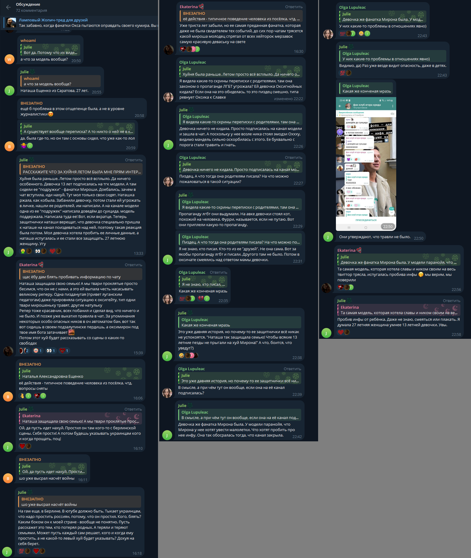 >«Мы со Славой, в принципе, могли бы быть вместе с 17-го года, сто процентов.» «Вот, и понимаете, это же огромная была работа, я с 17-го года сосала ему хуй, с 17-го, на баттлах, на стенках, в комментариях The Flow, делала с ними мемы, это был реально труд, блядь, ёбаный, сколько лет до 21 года я просто работала на благо антихайпа. Блядь, я со всеми дружила, со всеми сдружилась, даже, блядь, с Петриком Путяхой у меня получилось подружиться, блядь, я всех его, блядь, со всеми его, вот этими антихайповцами, со всеми была на короткой ноге.» «Я понимала, что я с ним не познакомлюсь, но я смогу познакомиться с этими лошками с 5000 подписчиками вконтакте. Я просто планомерно завоевала их всех, блядь, чтобы дошло до того, что он кого-нибудь спрашивает обо мне и все просто в восторге потому что я этим ребятам давала свой ресурс, общение. Я же красивая, у меня такие аватарочки были классные, блядь, сисечки и все такое и они прямо меня любили за то, что типа я такая прям классная и во всем разбираюсь вот, и короче, ну блин, это была реально огромная работа проделана просто, и главное то, что мужики же обычно как вы должны бороться за бабу я за свою царевну боролась с первого дня как я в него влюбилась.» «Блядь, блядь я на десять тысяч шагов вперед все продумала просто. Какая будет строчка на баттле, что мне вот здесь вот сделать чтобы было потом вот так, вот чтобы я написала потом вот так. Вот. Я очень сильно хайпила Куромушку, потому что я знала, что он очень сильно ее любит. Как я ей сосала в твиттере блядь вы бы только видели! «И не ей, а именно их паре, чтобы ему приятно было, понимаете? Чтобы, типа, если бы я просто его отбивала жестко, ее хуесосила, он бы мне сказал, типа, ты чё, охуела? Но я понимала, что для него важна женщина, для него важна семья. Блядь, если погуглить и посмотреть чё я там писала, блядь, про них. Блядь, цитаты из их интервью про то, что «я люблю тебя, Саня, и я тебя.» Я пишу, боже, как это мило, как они себя любят! Я сама думаю, блядь, какая ж наигранная хуйня. Типа, я выдавала ту реакцию, которую она хотела получить своей фейковой хуетой, блядь. И типа, Славе было приятно за то, что я сосу ей пизду.»