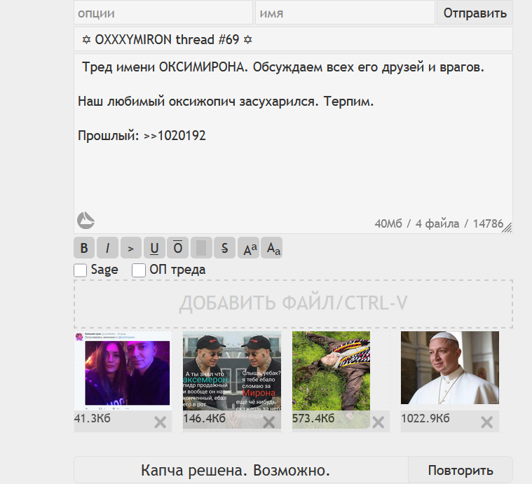 >>1021418 >>1021418 >Когда был айша гейт в треде жопича постили его хуек и прочую инфу связанную с айшей, в итоге поставили мочератора который подтирал неудобные посты. Потом он перестал появляться и тред сделали бесконечным чтобы посты сам по себе терлись Ну и к чему ты это? еще скажи в 17 году батолтред бесконечным сделали тк оксижопич и жопич проплатили