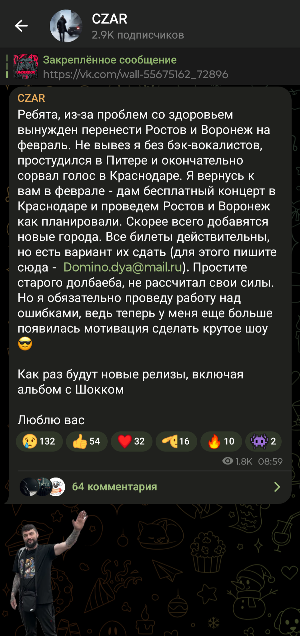 А помните Czar на интервью говорил, что вместе с Шокком и 1 классом смогли бы собрать олимпийский? Сейчас у него тур по Роccии, собирает клубы с вместительностью 70 человек. Кто-то уже ходил?