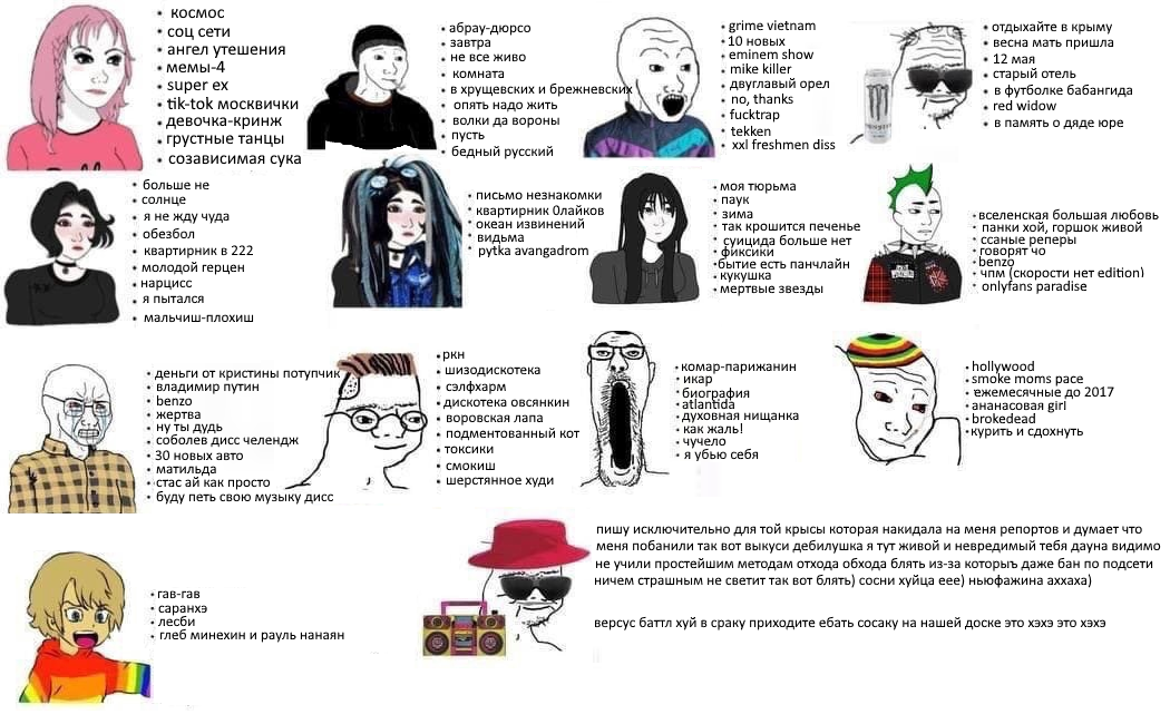 У меня из-за вас теперь фиксация на ТОЛЕ. Вообще его не слушал, баттлами не увлекался, знал просто что такой челикс есть. А теперь как вижу внезапно где-то упоминания ЛЖЕДМИТРИЯ или ТОЛИ то подрываюсь со смеху и пытаюсь представить ебало человека который это слушает. На ум приходит ебало Толи после того как у него шапку в бассейн бросили. Мне кажется ТОЛЯ и ПУКЕР могли бы тандем стремящихся омежек создать которых за спиной (хотя ну как сказать, в принципе в открытую) никто не уважает и над ними угарают. Типо такой друг над которым все ржут и даже в какой-то извращенской форме привязались, что вот рядом клуша ходит. Вот ТОЛЯ и ПУКЕР такое ощущение создают