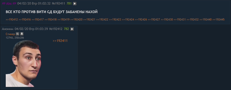 А еще после смерти паши техника я в /б упомянул город, в котором произошла оказия с отцом карицкой и написал на всякий случай что конечно же виноваты люди национальности на букву У Ну и параллельно в жопич треде тоже щитпостил как обычно И знаете чо? А мне за что-то дали бан без причины и срока и для разбана сказали написать в дискорд мочи, я хуею В общем будьте осторожны, вы тут не обезличены, если с того же айпи в вк сидите, то все посты здесь к вашей личности 100% прикреплены, фейки в вк с настоящим вк тоже соединены и когда введут соц рейтинг, миску риса вам никто не даст. на вас будет клеймо ДВАЧЕР и вас отправят в автобус, как хиккана намба ван, даже если вы тянучка.