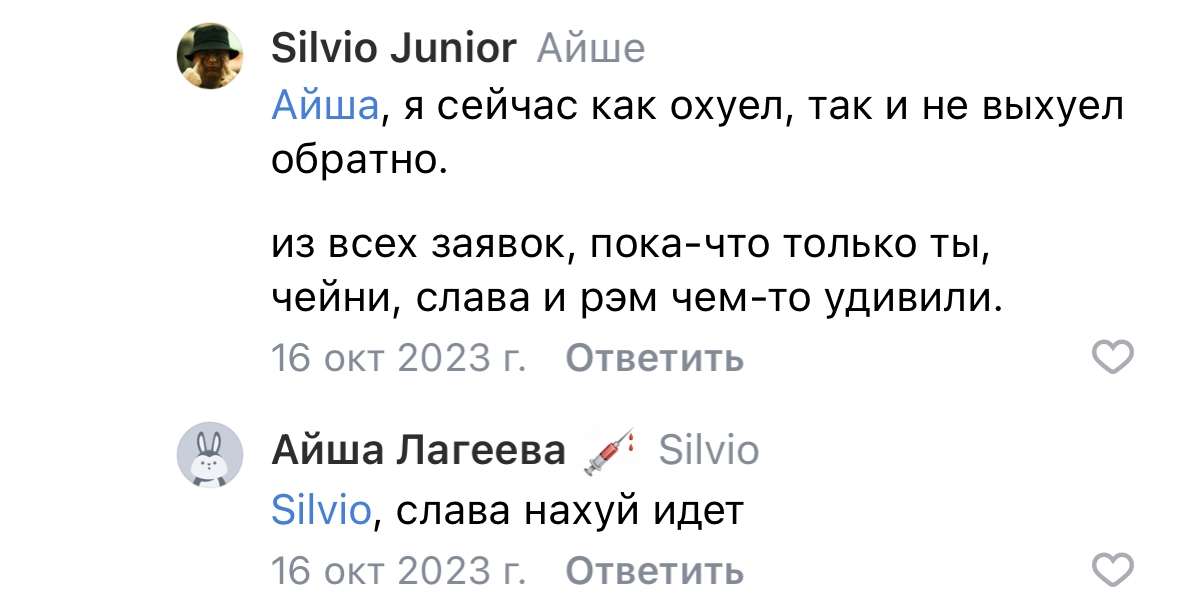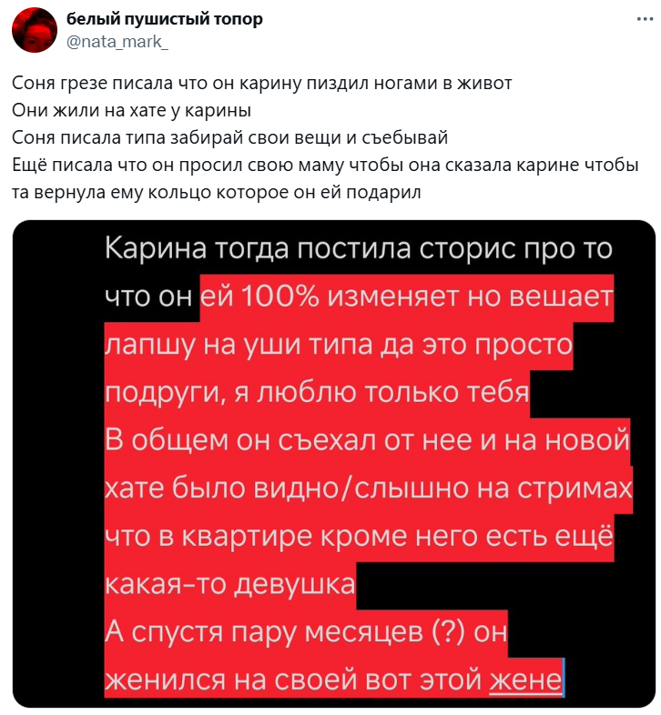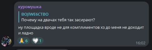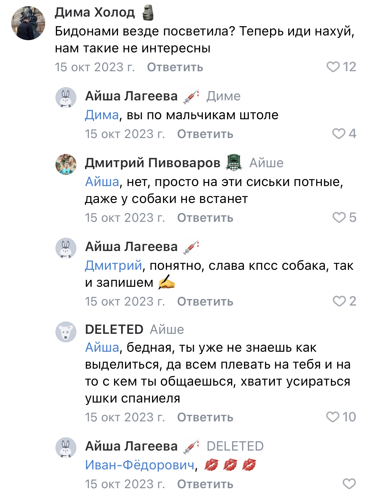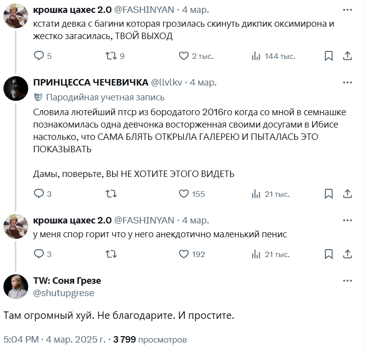 >>1039784 >>1039785 Да нихуя никто ничего не выявил. Сисы из этого тгк сами пришли к такому умозаключению, после изучения вк оксижопича и интервью с давним комментатором его стены. Они топят за то, что автор этих сообщений сама Кучак или Шокк. Никаких нормальных доказательств у них нет. И в этом вся ржомба, т. к. сисуни завели этот канал для расследования подкаста, потому что считают его притянутым за уши, а они ща быстро все докажут и разъебут подкастерок. И при этом они сами раздувают из мухи слона, фантазируют и занимаются откровенной травлей быших оксижопича. Сами пролистайте их канал и чат, там одни фантазии и домыслы, сплошные простыни бессмысленной хуйни, как-будто нейросеть писала.