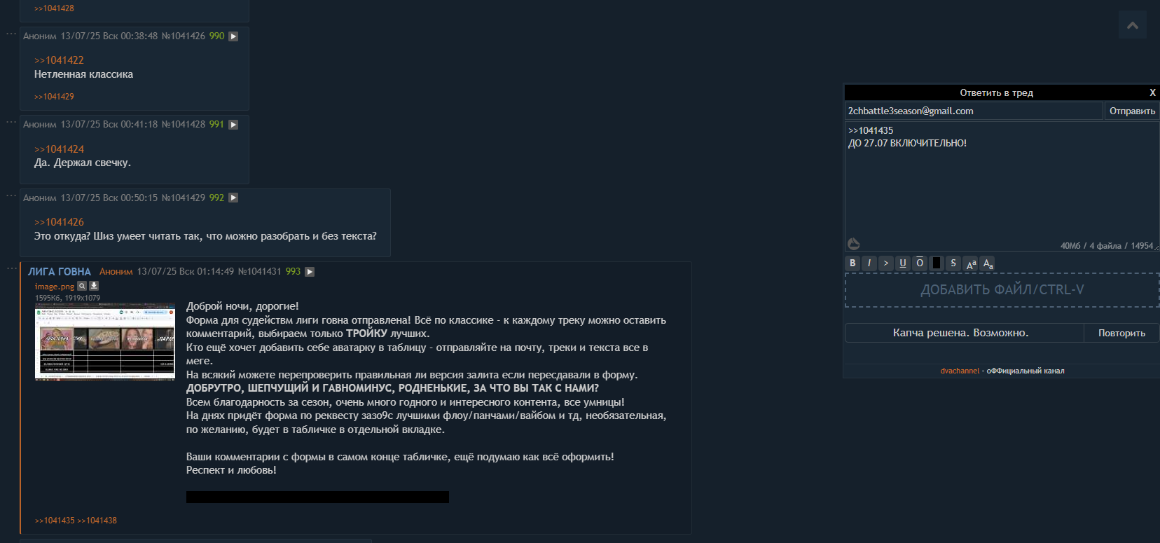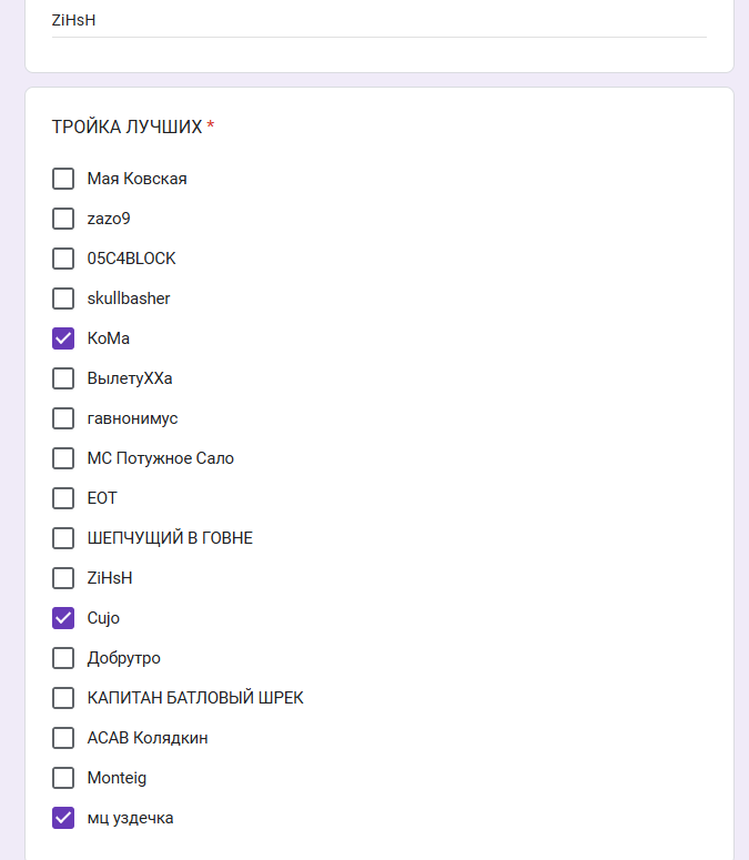 Доброй ночи, дорогие! Форма для судействм лиги говна отправлена! Всё по классике - к каждому треку можно оставить комментарий, выбираем только ТРОЙКУ лучших. Кто ещё хочет добавить себе аватарку в таблицу - отправляйте на почту, треки и текста все в меге. На всякий можете перепроверить правильная ли версия залита если пересдавали в форму. ДОБРУТРО, ШЕПЧУЩИЙ И ГАВНОМИНУС, РОДНЕНЬКИЕ, ЗА ЧТО ВЫ ТАК С НАМИ? Всем благодарность за сезон, очень много годного и интересного контента, все умницы! На днях придёт форма по реквесту зазо9с лучшими флоу/панчами/вайбом и тд, необязательная, по желанию, будет в табличке в отдельной вкладке.