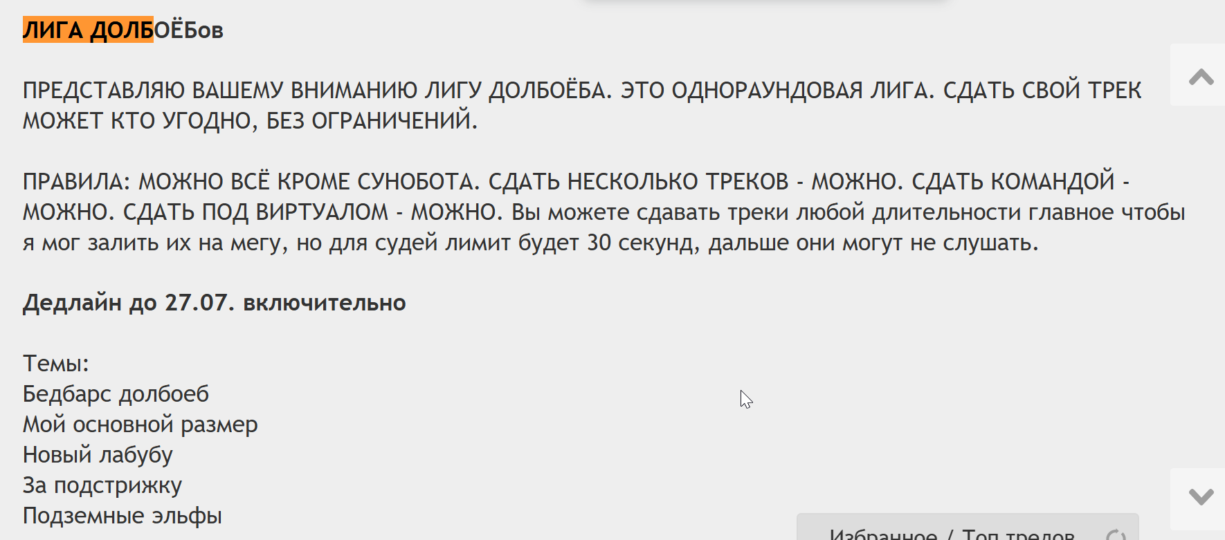 ПРЕДСТАВЛЯЮ ВАШЕМУ ВНИМАНИЮ ЛИГУ ДОЛБОЁБА. ЭТО ОДНОРАУНДОВАЯ ЛИГА. СДАТЬ СВОЙ ТРЕК МОЖЕТ КТО УГОДНО, БЕЗ ОГРАНИЧЕНИЙ.