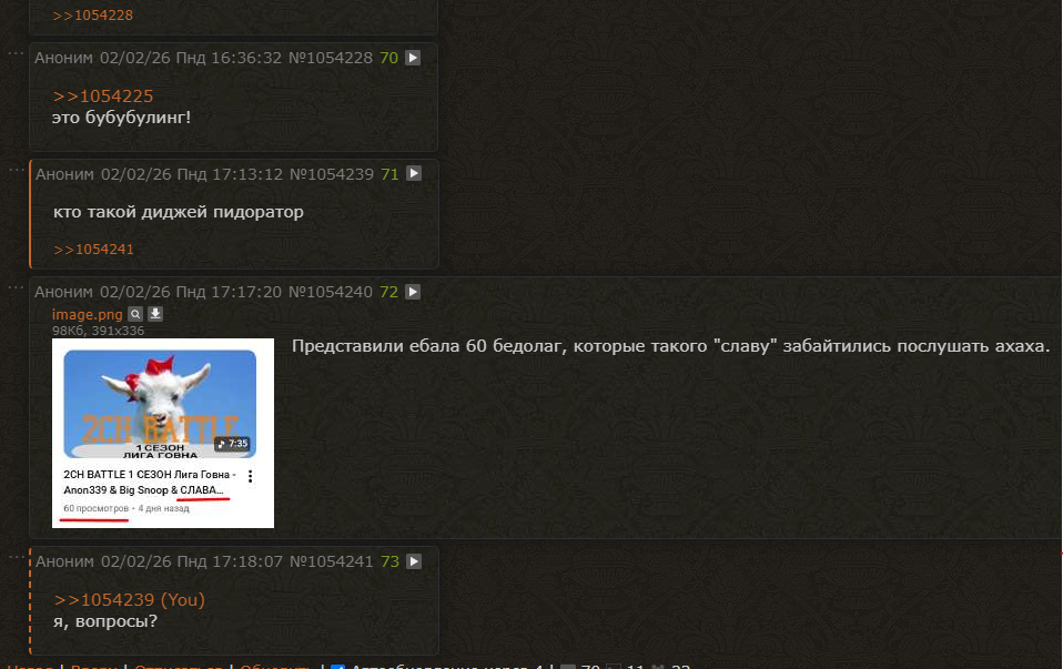 Регламент: Тот же самый что и в прошлый раз. Сдача треков происходит путём загрузки файла трека по форме (в оп посте для отбора, в остальных раундах форма будет приходить на почту участника). Также если очень не хочется палить фейкомыло трек можно сдать в тред с каким либо пруфом который подтвердит твою личность, например огромный самотык с автографами Альбины Сексовой и Стаса Барецкого, хуй знает. Просто кидаете пруф, ссылку на трек и свой ник. В следующих тредах при выставлении оценок и сдаче следующих треков нужно будет также использовать ПРУФ КАК ПРУФ. Для каждого раунда определена тема (или несколько тем, в таком случае достаточно раскрыть лишь одну тему на выбор) и ограничение по длине трека (можно незначительно превысить на 10 или 20 секунд если прям совсем нужно, но не наглеть). Батл одиночный, не командный. Для всех должно быть очевидно что на треке участвует один человек. Начиная с парных раундов разрешены гостевые участники для бэков, припевов и прочей подобной лабуды. При этом гость должен занимать меньше четверти трека относительно участника батла. Леваки сдавать запрещено, определяются путём несоответствия трека теме раунда. Виртуалы (участие в батле под несколькими разными никами) запрещены. При раскрытии виртуала участник будет дисквалифицирован вместе со всеми раскрытыми виртуалами. На одного человека только один трек. Никаких СуноБотов. Исполнять должны вы. ВойсМорфер использовать можно. Первый раунд — отборочный, остальные парные. В парных раундах в каждой паре будет только один победитель, который пройдёт в следующий раунд. Пары будут распределяться случайным образом без подкруток.