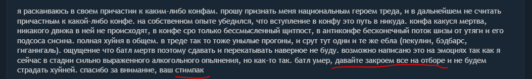 >>1055033 >>1055034 >>1055031 Бля, пиздец вы типы, конечно, странные. Вы понимаете, что "конфа" это люди, а не должность какая-то, не кружок, не тайная вечеря. Не важно какой коммуникацией пользуются эти люди, чтобы общаться, допустим это будет чат в телеге. А зачем каким-то людям общаться друг с другом? правильно, им это интересно тогда, когда их что-то объединяет, например общий интерес участников баттла, приятно делиться друг с другом мнениями, впечатлениями, общаться. А когда баттлы для этих людей умерли им уже не о чем общаться, всё, какой чат новый не создавай - он мёртв, никто туда не будет заходить, ничего писать, не о чем говорить. Простите, что разбил ваши странные розовые очки.