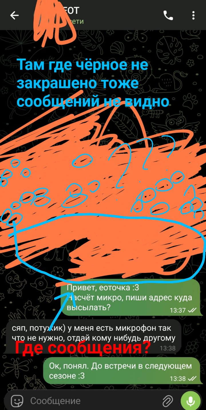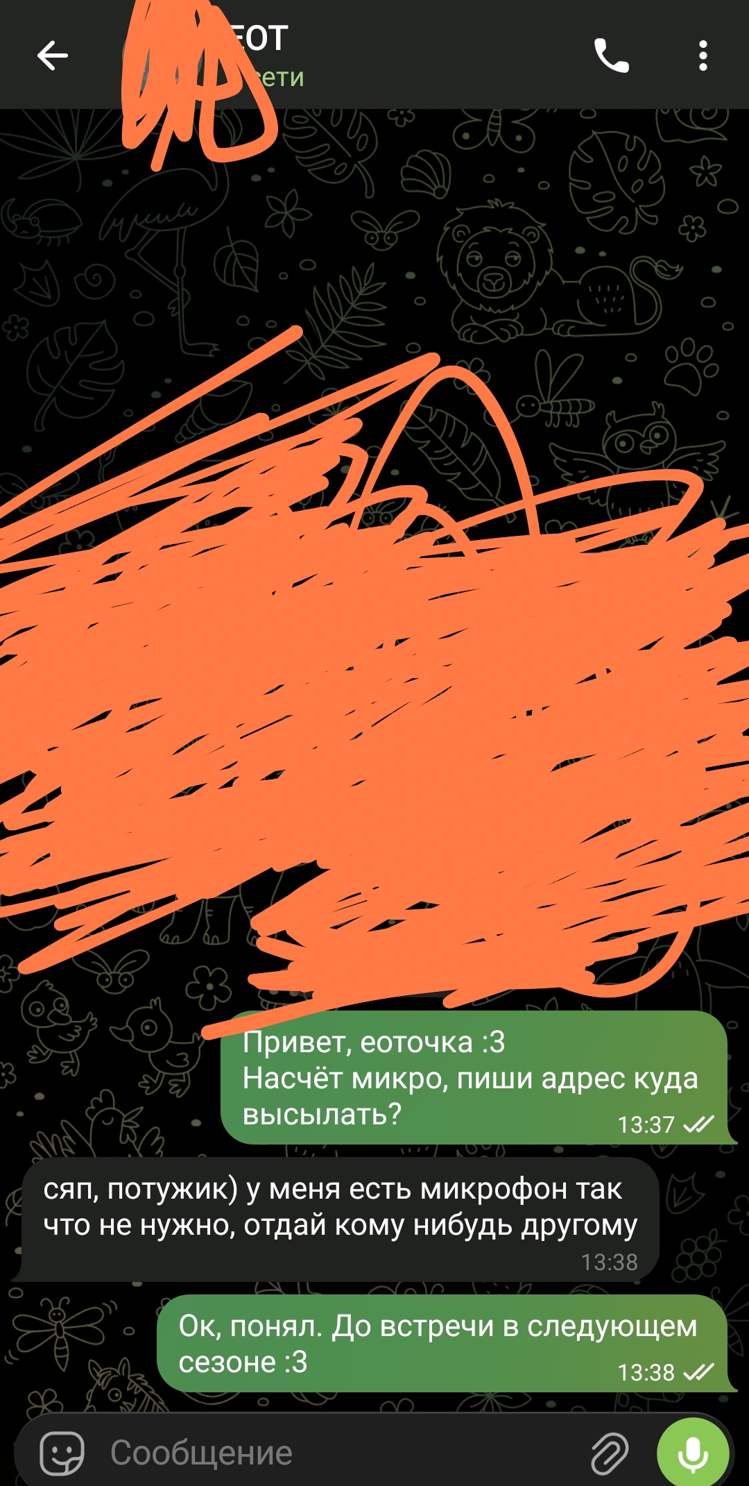 >>1057066 Она сама со мной связалась, я же оставлял данные свои чтобы победитель смог микро получить, в том числе и свою телегу. Она связалась, я её поздравил с победой, но это я закрасил, так как это не важно. Спросил адрес, она сказала, что ей не нужен микрофон. Ну вот зачем мне врать?