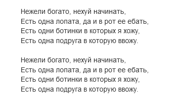 Даа... сцуки.. С этим "открытым письмом" Нас вынудили обратиться к Вам объективные Обстоятельства - тяжелая Экономическая и моральная обстановка, сложившаяся в Кузбассе... Нахуй социальный конфликт, общество горит Как патыканая шлюха, знающая иврит У планеты гастрит, а мы - кровавый понос Статистка сама за себя всё говорит Парламент мудит, мудилы тоже мудят После анонизма идут в детский сад Чирийный педофил придумал этот мир На члене дьявола спит, живет и кряхтит Нет больше сил Своими словами пидрил, я как пометом кормил Смысл уместил в муждстрочьях, захуярил засыл За просто так порвал мудил в клочья Нет ничего, что бы не мог смочь я Как вампир живу только ночью Рассуждать слишком поздно о перспективах морального роста Все просто - с гопнической жопы грызи каросту Музыка... Вонючий хип-хоп, захерачим вам в лоб.. ..ок.. католический поп, вскрыватель вонючих жоп Мир ждал и я пришел, раскрыл рот даже гоп.. Заткни хвост промеж ног, ниже меня только сена стог Я столп рэпа, читаю загружаю в режиме нон-стоп Вонюч как панк-рок, дай мне вагон баб И я выдою их сок; стереотипы жег, рифмы как электрошок Через тело в пизду и через мозг в потолок Самый меткий стрелок, качаю сосунков как мор.флот Рублю хер на части и пихаю в мешок; Плюю на протесты, на провокации, высокие жесты Модные рации, пейджера, ЭсМэЭсы, ДжЭЭсЭмы Сосите все у ЭмЭмЭма В рот берите по очереди, мажте малинового джема Я заставлю вас пиздатые мудилы, в глаз ебать крокодила Огромный фаллос ждите в глаз, моя ручная горилла Нассыт на вас, бегите в первый класс Читайте как Элли покинула Канзасс Вы - страшилы, а я железный дровосек нахуй порублю вас И уничтожу на век, гомофоб с детства, как Гайдар, как Чук и Гек По степени ноетложности мой рэп Превосходит финансовые возможности фирмы кемеровохлеб Приготовься к атаке, понимать нас будет сложно Как выковыривать говно из протектора подошвы Чтож вы попрятались, спрятали головы в анус В поливае фикалиями вас тверд останусь Я пророк превдестник заката жизни, одинок как парус Если ты тот кто может только трепать во сне свой фаллос Прячся в кладовке, теребя свою головку Это громом с небес пришел конец твой. тебе неловко? Можешь забыть свои педеристические уловки Разбегайтесь как грязные заебаные прошмандовки Замри и бойся в позе писю-в-нос-через пятку Сатанические сволочи устраивают блядки Колядки ужасных всемогучих мозгоебов Берегись нас как часотки, как гонореи, смотри в оба Моя злоба льется бурля через края Чтоб была залита каждая изъебложопая свинья С визгом изпуская свои последние ветра Твои система существования стара можешь пойти посрать Бля, я вклчаю таршер рядом с твоей ложей Я тот, кто кусок говна на подушку тебе положит Если оправдать наливчие в мире тебя не сможешь Заглотнуть четыре знаменитых кровяных колбаски можешь See upcoming rap shows Get tickets for your favorite artists You might also like эксгибиция богодьявола (exhibition of goddevil) макулатура (makulatura) нейт диаз (nate diaz) макулатура (makulatura) Lose Yourself Eminem Мистер Лёша он де майкрофон Быстрее проверяй басов фон, или будешь погребен, старый занюханый гандон... Ааа.. Я Кихот Дон, загоняю коров в стойла, что стоит мне выжрать водки вагон? я буду трезв с двух тонн этого пойла Мойша, берегись, моя атака тяжела для Израильских крыс, я не нацист и не скин, но лучше рядом не ебись, иначе подхватишь СПИД путем клизмы в миниск нашим людям я скажу одно 