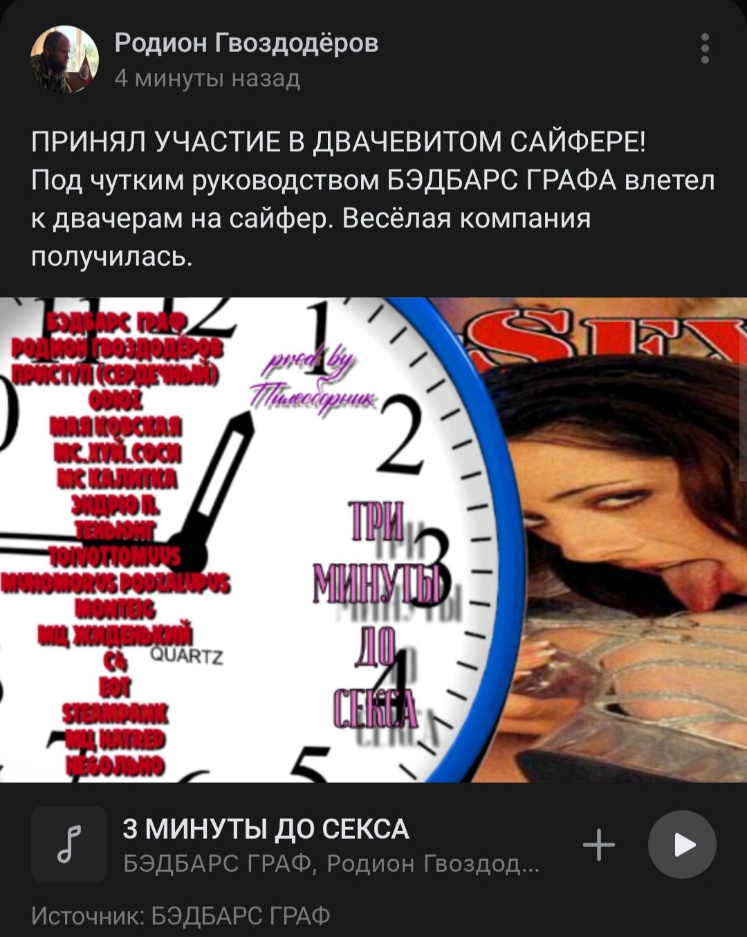 Найс затролили тредовских дешевок)) теперь они будут думать что случился эффект манделы, ведь тема была "3 дня до секса", а потом изменили на 3 минуты до секса. Сыча и прочий сброд вырезали кста)0))