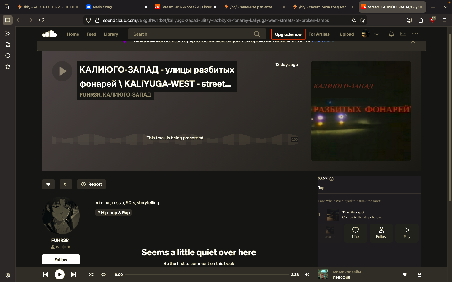 Два с хуем года назад я родил один из своих первых рэп-треков. https://vocaroo.com/1esB61hUpdCY Сколько я потом мучал микрофон, фрутилупс, сэмплер в разных стилях — поднял продакшн на фирмовый уровень, начал читать попсу, потом стилёвый индастриал хип-хоп — только в одном треке смог приблизиться к ламповости этого, всё остальное как будто мимо. Нет души. Вчера попробовал после долгого перерыва записать новое с оглядкой на атмосферу, но всё равно что-то не то. Разъебите прям в хлам, чего тут не хватает и почему он говно. https://vocaroo.com/1lisLDoyfOf0
