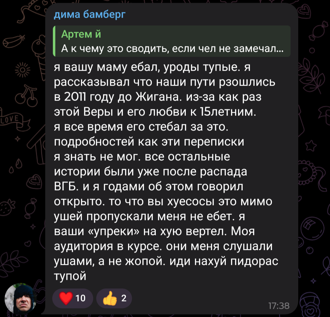 Да тут дело не в фемках. А в том, что чел реально больной. Писать тринадцатилеткам на протяжении трех лет, и как не заебало его? И параллельно написывал другим пиздючкам. Это одержимость элементарная. Я вот представить себе не могу, чтоб я общался онлайн с какой-то маленькой макрощелкой 3 года по тырнету, при том что общих интересов особо-то и нету. "Детка, ты сделала задание на 5 с плюсом", "Папа окси доволен", "Сделай фотку в стрингах". Ну вот что это за хуета? Извращенные переписки с малолетками + В то же время крутил-мутил с Верой. Думайте.