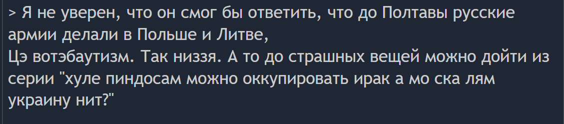 >>1019201 Главный тейк у него был в том, что он не знает, почему началась Северная война, и сколько она длилась. Т.е. он даже не в курсе предпосылок появления своего родного города. Я не уверен, что он смог бы ответить, что до Полтавы русские армии делали в Польше и Литве, и почему эта война началась с похода саксонской/i] армии на Ригу. Он просто тупой дед-полкан на пенсии, который историю знает хуже двачеров, учивших ее по играм Парадокс.