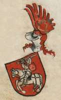 «Почти каждая из них имела в гербе на красном поле вооруженного мужа, который сидит на белом, несколько на черном, или рыжем либо пестром коне и потрясает рукой с мечом».