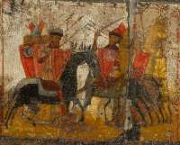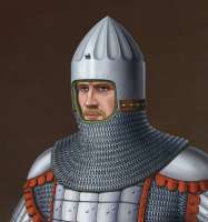 >>768041 Знатный тяжеловооруженный всадник 14 века носил шлем с личиной или полумаской и бармицей, кольчугу, поверх неё ламелляр или чешую, усиленные зерцалом, наплечники, наручи, рукавицы, на ногах - кольчужные чулки либо поножи. Сверху обязательно красный плащ. Вооружался копьем, мечом или саблей, кинжалом, чеканом, кистенем/булавой/шестопером, иногда еще и сложносоставным луком. Щит у него был каплевидный, червленый, с православным крестом. Ездил на боевом коне (обязательно защищенным кольчужной попоной или кояром и наголовьем), управляя им шпорами.