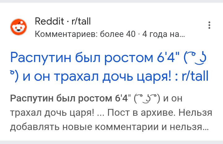>>1009117 О высоком росте Распутина заявляли: 1. Французский посол Морис Палеолог. 2. Учитель французского языка детей Николая II швейцарец Пьер Жильяр, служивший позднее во французской военной миссии при Правительстве А.В. Колчака и получивший Орден Почётного легиона — высший знак отличия Франции. 3. Тэффи — русская писательница, сестра генерала Н.А. Лохвицкого, соратника А.В. Колчака, выбравшая псевдоним из творчества Р. Киплинга — фанатичного британского империалиста и русофоба — и эмигрировавшая после Революции во Францию. Больше ничего не нашёл.