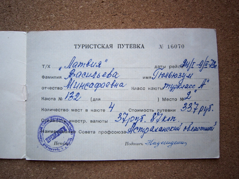 >>1005893 >купить туристическую путёвку на Венецию >Стоимость туристической поездки в Италию в СССР составляя от 500-800 рублей >теплоход по маршруту Одесса — Пирей — Неаполь — Валетта (о.Мальта) — Стамбул — Одесса действительно ходил. Всего 337 рублей за путевку. >в момент прохождения у берегов Филиппин, бежал советский гражданин