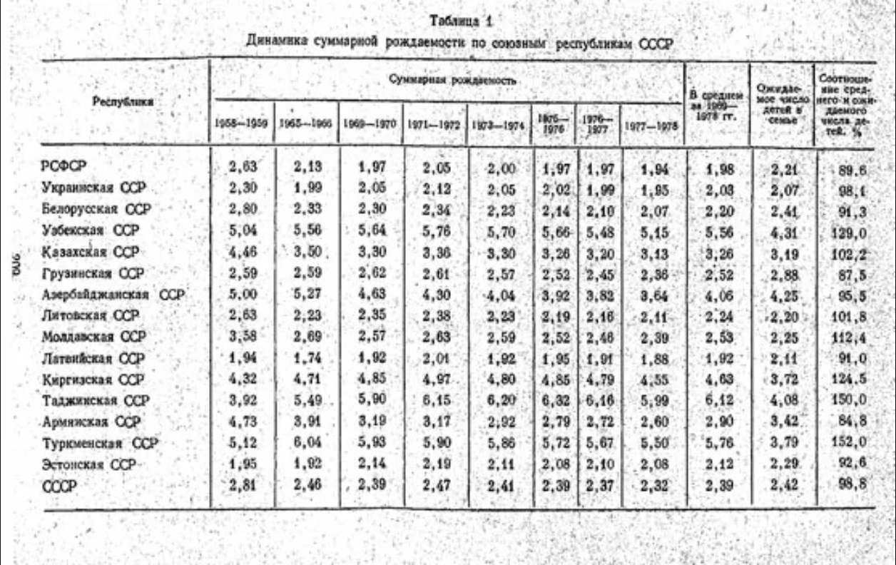 >>1015844 Какая хуцпа бля! Как так же научится хуцповать? Там в 60-е снижение рождаемости во всех республиках, на территории которых проходили боевые действия в 40-е и Армении с Грузией, очевидно это демографическое эхо ВОВ. Потом в этих же республиках рост рождаемости к началу семидесятых, потом во всех республиках, даже в Среднеазиатских медленный спад. Исключение- Азербайджан, где везде виден спад рождаемости.