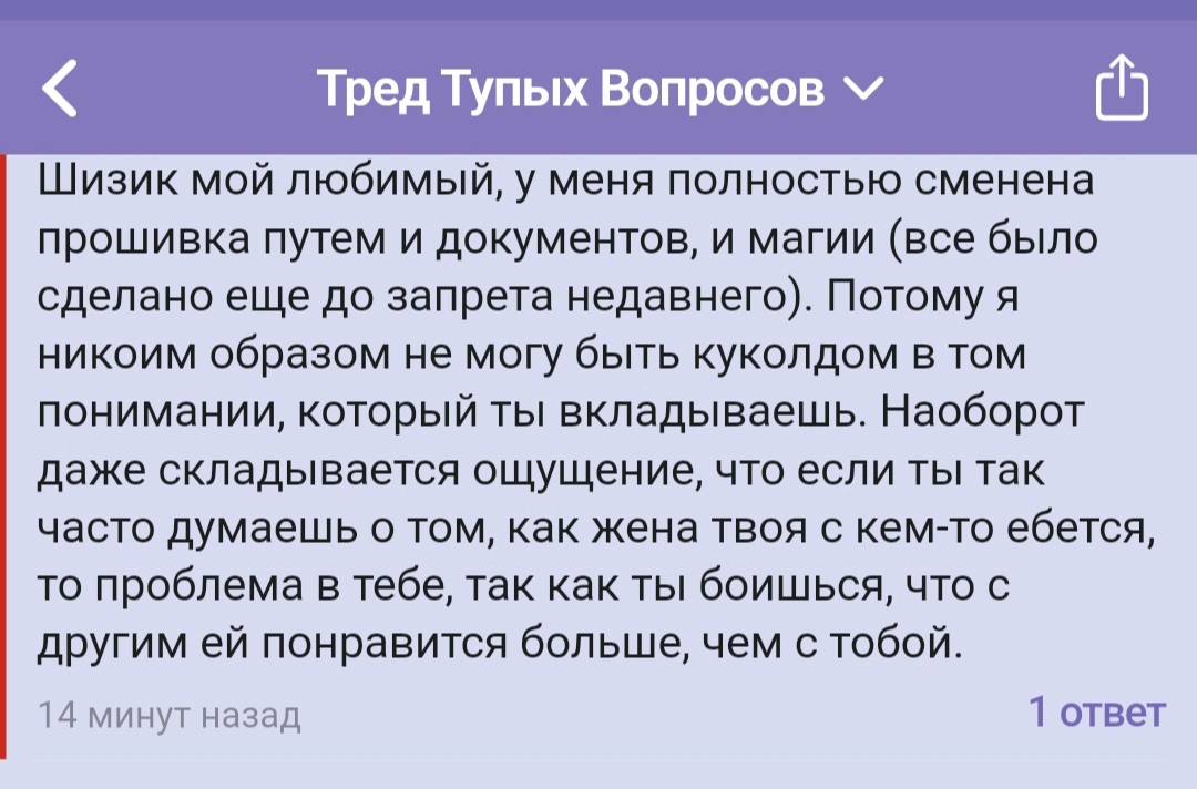 >>1021438 >более высокая мораль Ага, верим объективной оценке совершенно честного человека. Хотя, может, ты и прав, по твоим маоистским критериям у тебя может мораль и выше. Кто вас разберет. Ну, а половину населения земли за людей не считать. Че, мелочь. >кошельку удивительное сочетание плача о прекрасном прошлом, при этом неприязни к совершенно естественной позиции, когда партнер для женщины выбирался исходя из его материального положения. Главное ещё не дойди до мысли, что все европейские феодалы были фашистами, которые специально лишали секса бедных мужчин, выбирая для дочерей супругов. >>1021428 У тебя реально в голове есть мнение, что все мужики на что-то поддались, потому теперь страдают? Или может твои баре просто опять вытерли тобой пол, пнули как собаку, опять подобрали тебе наиболее убогий вариант, а ты их продолжаешь считать своими, жалеешь, вот несчастные, неправильно мы выбрали, ээээххх, бабы нас теперь угнетают