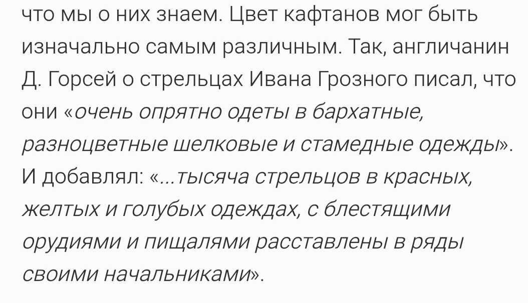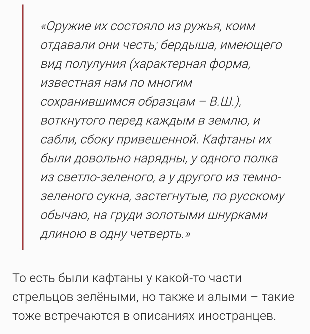 >>1024133 Во всех письменных источниках и на цветных изо 16-17 века московские стрельцы в цветных кафтанах. Это я специально написал что они тоже будто бы всегда носили сермягу. На самом деле это только в конце 17-начале 18 века после стрелецкого бунта когда московские стрельцы были лишены своего элитного статуса и были переведены в гарнизоны других городов, тогда им перестали выдавать цветное сукно на кафтаны.