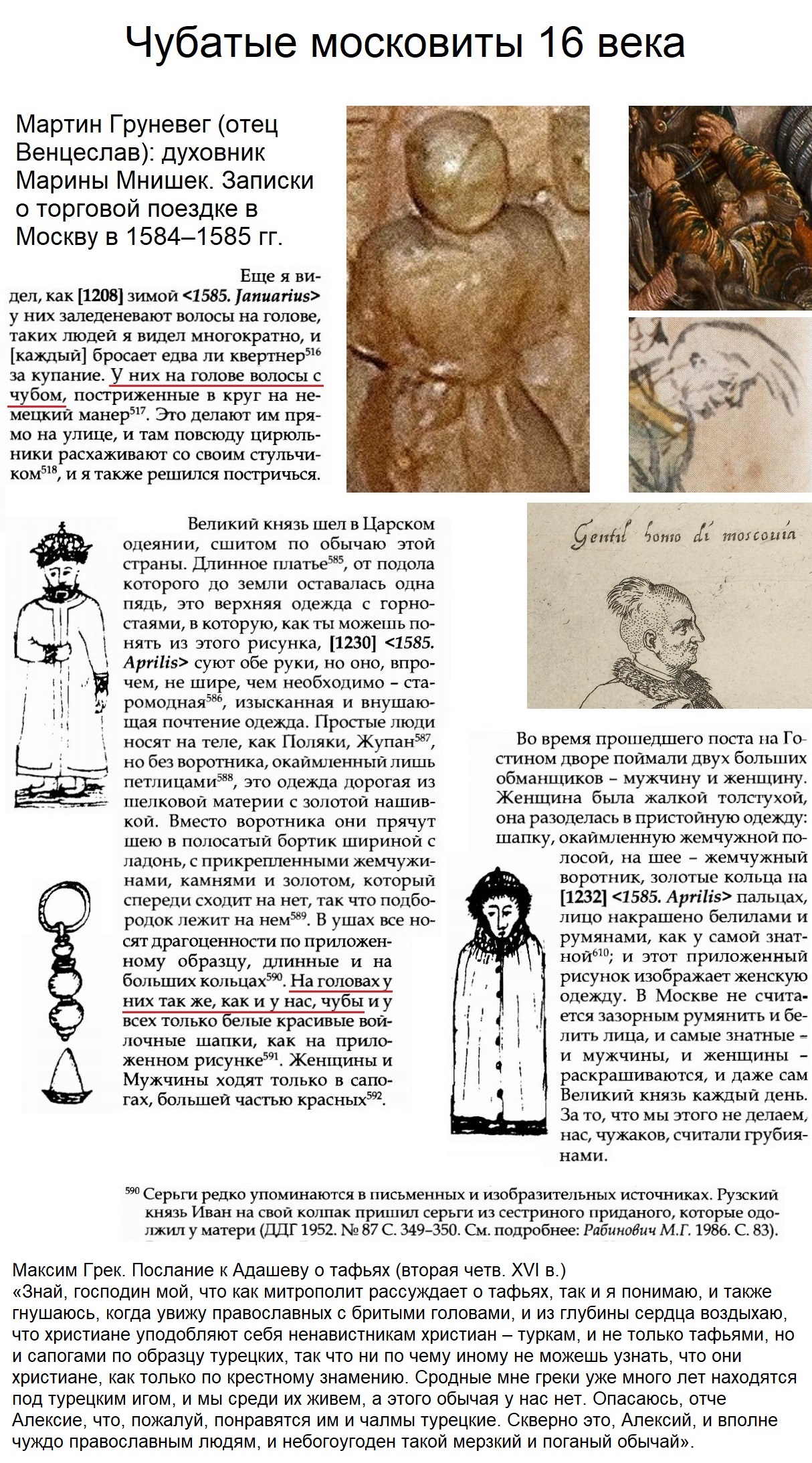 На видеориле реакция Максима Грека на мoскoвитов 16 века в турецких сапогах с загнутыми носами, в широких азиатских шароварах, в польских жупанах, с обритыми волосами на голове с чубом, с мусульманской тафьей под татарским колпаком на голове, с серьгами в ушах, с накрашенными косметикой лицами и бровями.