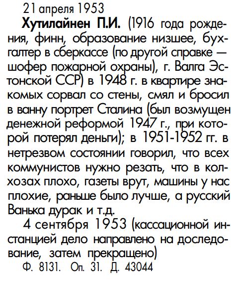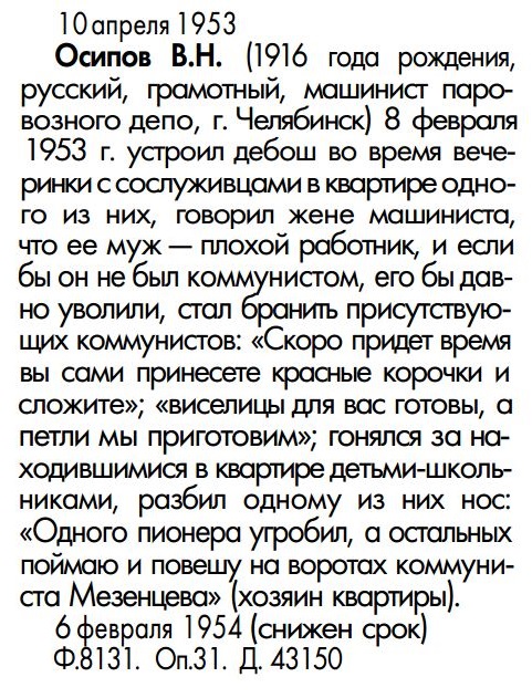 >>1013386 >Федоров Н.П. (1921 года рождения, русский, грамотный, слесарь, ст. Златоуст Челябинской области) >если будет война, то он на фронт не пойдет, а перестреляет всех начальников