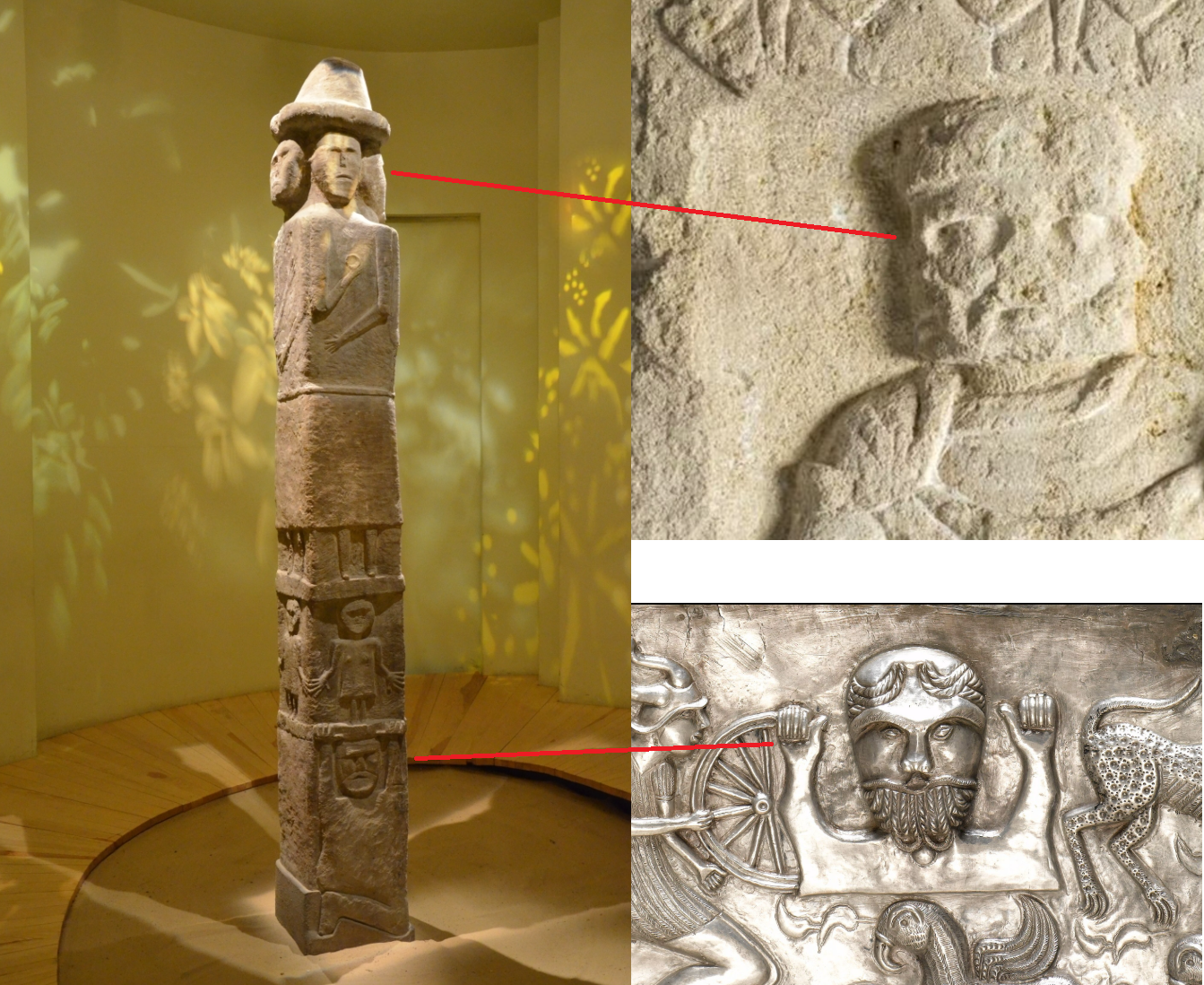 Збручский идол похоже изображает ирландского Лугуса(Lugh). Во первых Луг изображался часто трёхголовом, во вторых есть изображения где он держит так же руки как чел у основания идола вообще это древний символ и связан с египетским kꜣ (ka) 𓂓