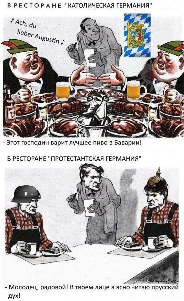 >протестантская германия хуже католической Das >Ну вот чем Мюнхен или Штутгарт хуже Гамбурга? Всем лучше, ведь Мюнхен и Штутгарт это католические земли Прусский дух, терпение, армия, порядок, орднунг ряженая армия с закрашиванием травы и подметанием плаца, четкая иерархия это все в России от протестантской Германии.