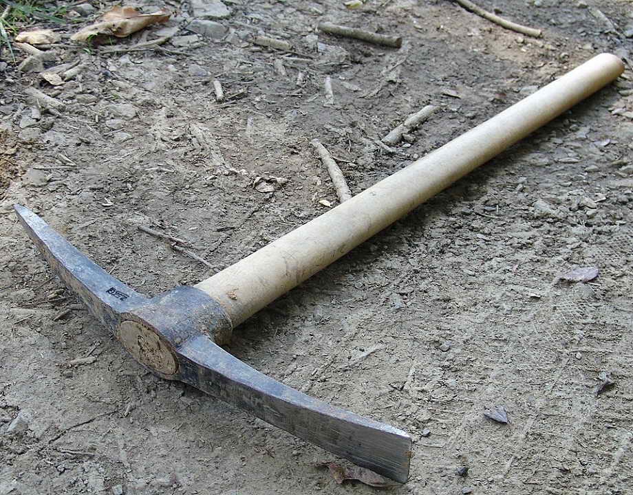 Кирка - мотыга - это тяжёлый сапёрный инструмент. Если лопата не лезет в землю, - сначала надо рыхлить кирко-мотыгой.