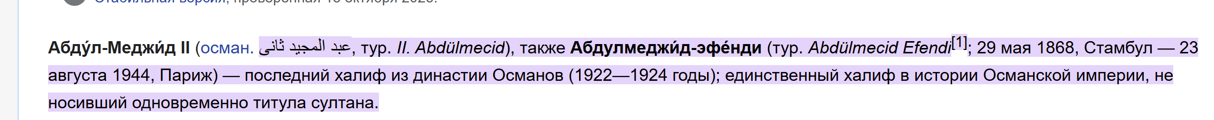 >>1011033 Халиф и султан разные должности. БОльшую часть времени их совмещали тогда порта была халифатом. Были периоды когда султан не был халифом но халиф наличествовал тогда порта халифатом не была. Сообразил нет?