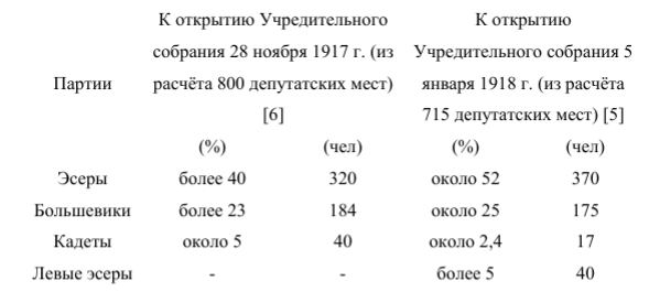 собрания 28 ноября 1917 г. (из Учредительного собрания 5 Партии расчёта 800 депутатских мест) / января 1918 г. (из расчёта