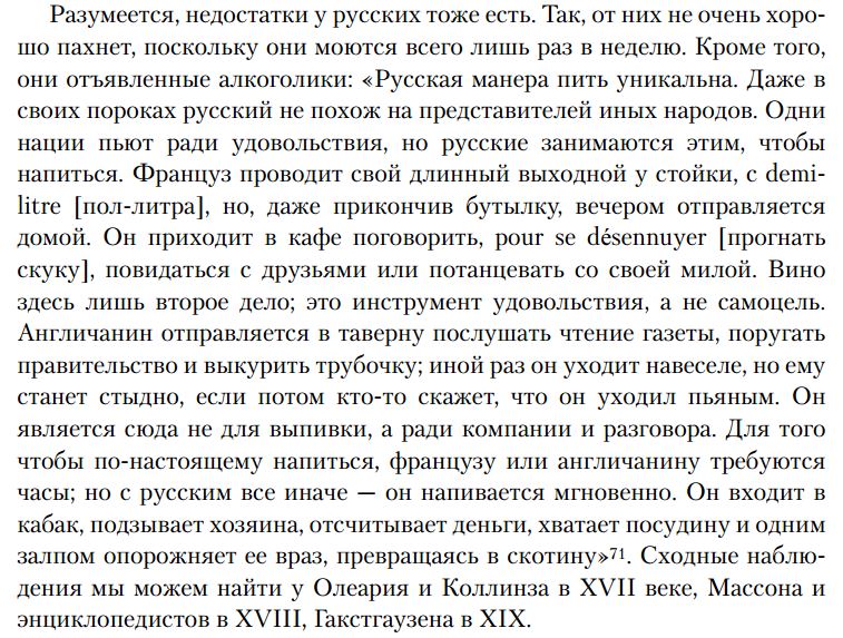 Столь мрачные мысли о природе русского деспотизма приводили Кюстина и к пониманию тех качеств русского крестьянства - изворотливого упорства, озверения и скрытого до времени анархизма, - которые требовали совсем иных способов правления, чем в других странах. Подобно многим западным путешественникам, начиная с первого постоянного посланника Герберштейна в XVI веке (Смотрите его известное замечание о России: «Неизвестно, или народ по своей загрубелости требует себе в государи тирана, или от тирании Государя самый народ становится таким бесчувственным и жестоким»), он не мог не задаться вопросом, насколько жестокость правления явилась неизбежным следствием национального характера, и был готов безоговорочно принять это в качестве оправдывающего обстоятельства: