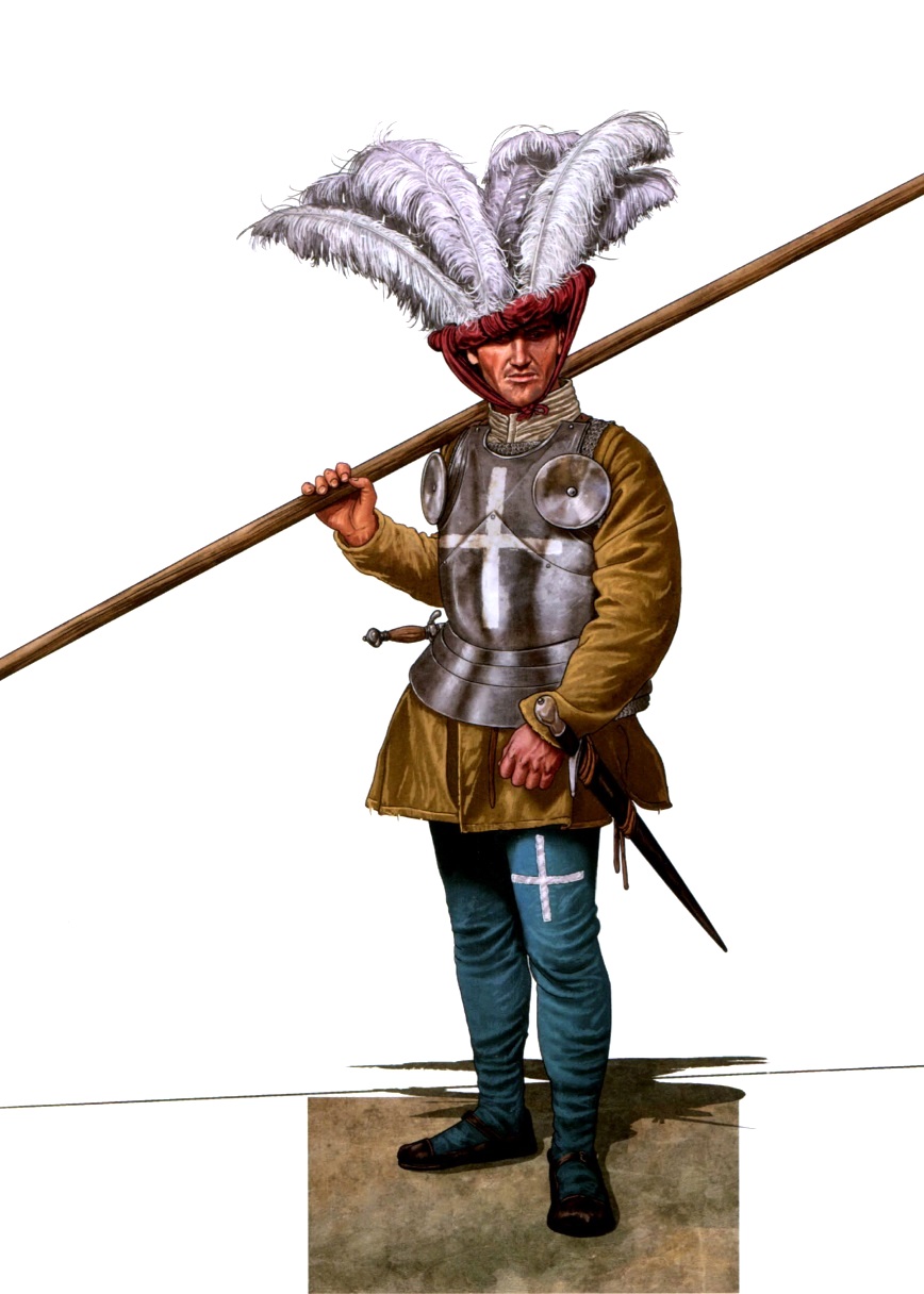 >М. Монтень так отзывался о боевых качествах немцев и швейцарцев в сравнении с итальянцами, испанцами и французами: «Сообразительность и проницательность итальянцев… так велики, что они заранее способны предвидеть подстерегающие их опасности и бедствия, поэтому не следует удивляться тому, что на войне они часто спешат позаботиться о своем самосохранении еще до столкновения с опасностью, между тем, как французы и испанцы, которые не столь проницательны, идут напролом, и им нужно воочию увидеть опасность и ощутить ее, чтобы почувствовать страх, причем даже и тогда страх не удерживает их; немцы же и швейцарцы, более вялые и тупые, спохватываются только в тот момент, когда уже изнемогают под ударами…».