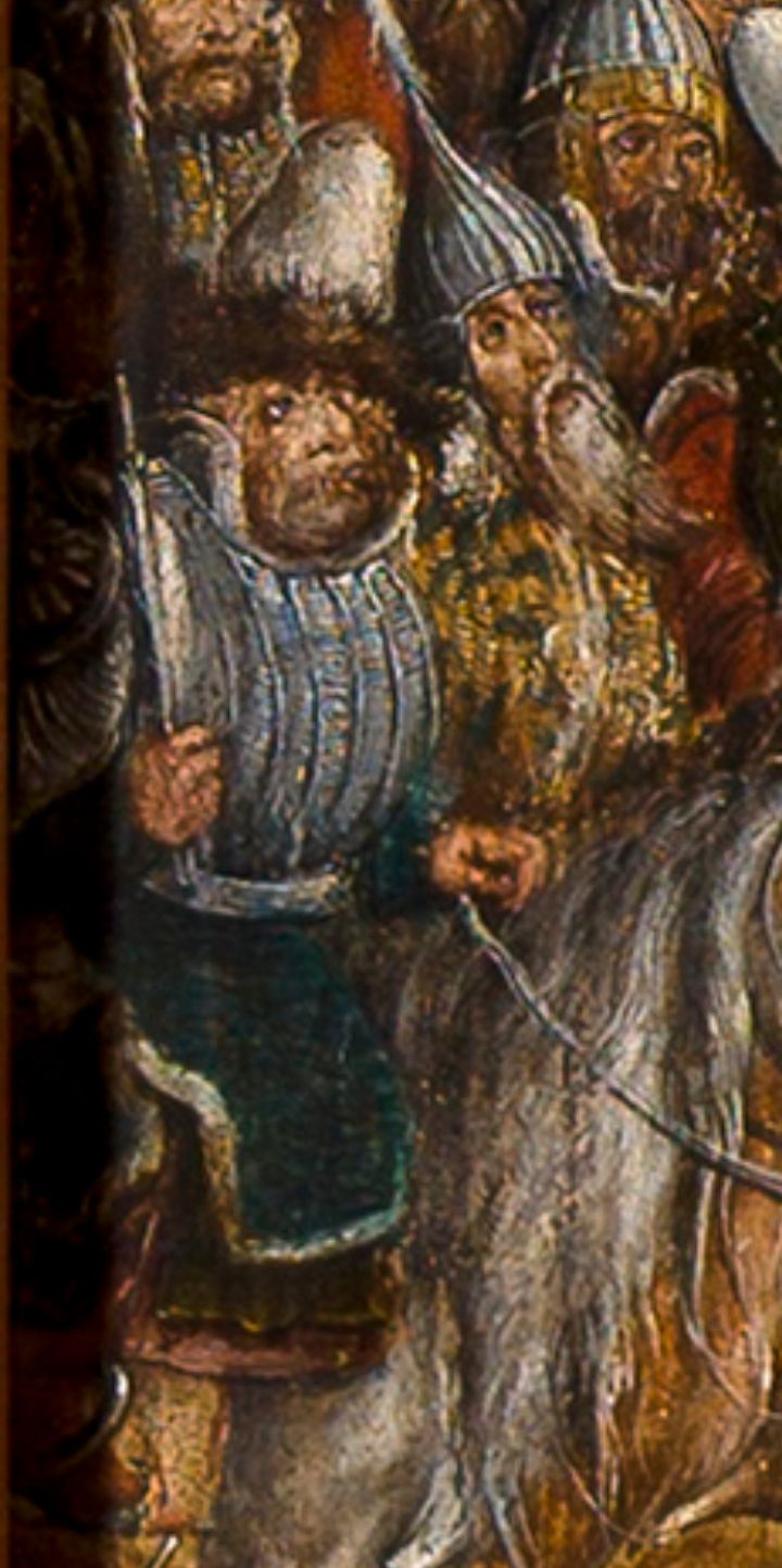 И что вы думаете? Этот немецкий еблан нарисовал одного мосоха с круглым зерцалом на руке (!) и трёх типовых мосохов в кафтанах, бехтерцах и шапках/шеломах, но с европейскими наплечниками на руках! Любому здравомыслящему человеку очевидно что это полный бред и эти трофейные мосохские латные наплечники, возможно даже три пары, потому что они все разные на картине, принадлежали фуллплейтным латным псково-новгородцам, а не каким-то ориентализированным залесским мосохам в бехтерцах как на картине. Но немецкий еблан этого не понял и присобачил наплечную часть фуллплейта к бехтерцу!