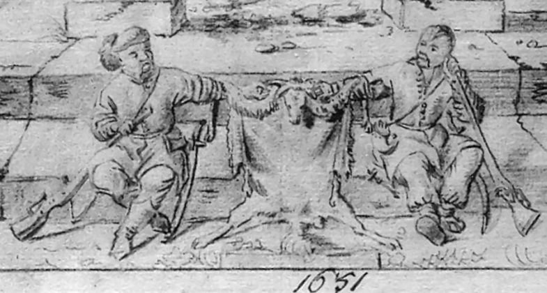 Некоторое представление об одежде казаков времен Освободительной войны дают картины европейских художников, в частности очевидца событий — голландца Ван Вестерфельда. Казаков изображали в короткой верхней одежде: сермяге, кафтане или доломане. Поэтому хорошо видно, что у них комфортные неширокие штаны. В источниках, касающихся казачества, мы до конца 17 столетия не встретим ни одного изображения широких шаровар с мотней.