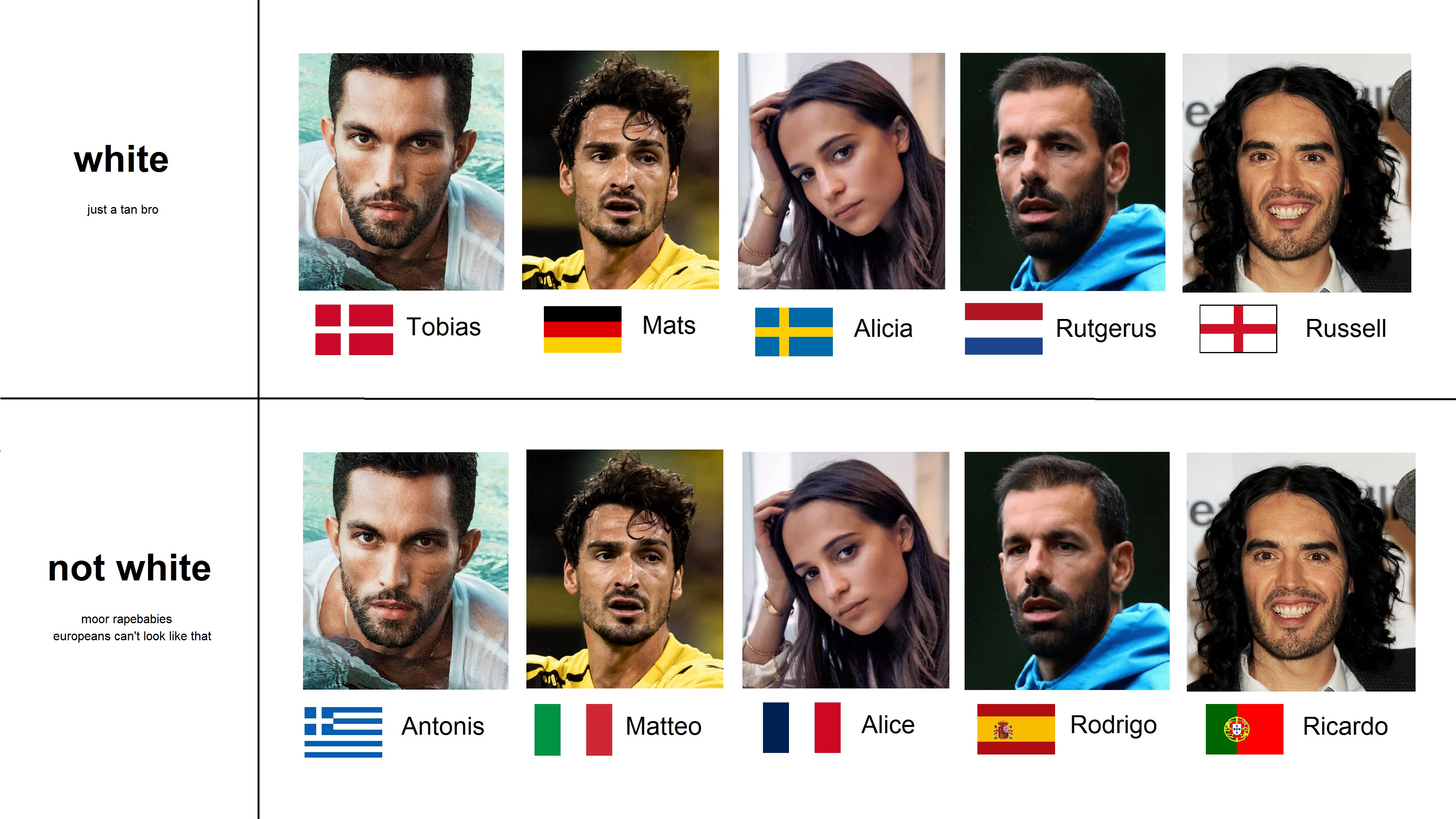 >>985800 Ну здесь вообще забавная штука, вот смуглые греки/португальцы белые, но вот такие же смуглые сирийцы уже не белые, почему? Да хрен его знает где тут логика, бьюсь об заклад если б греки были дикарями без богатой куьтуры, их бы выписали из белых, а так по факту если португальцы белые, то марокканцы/турки тоже, или так или никак.