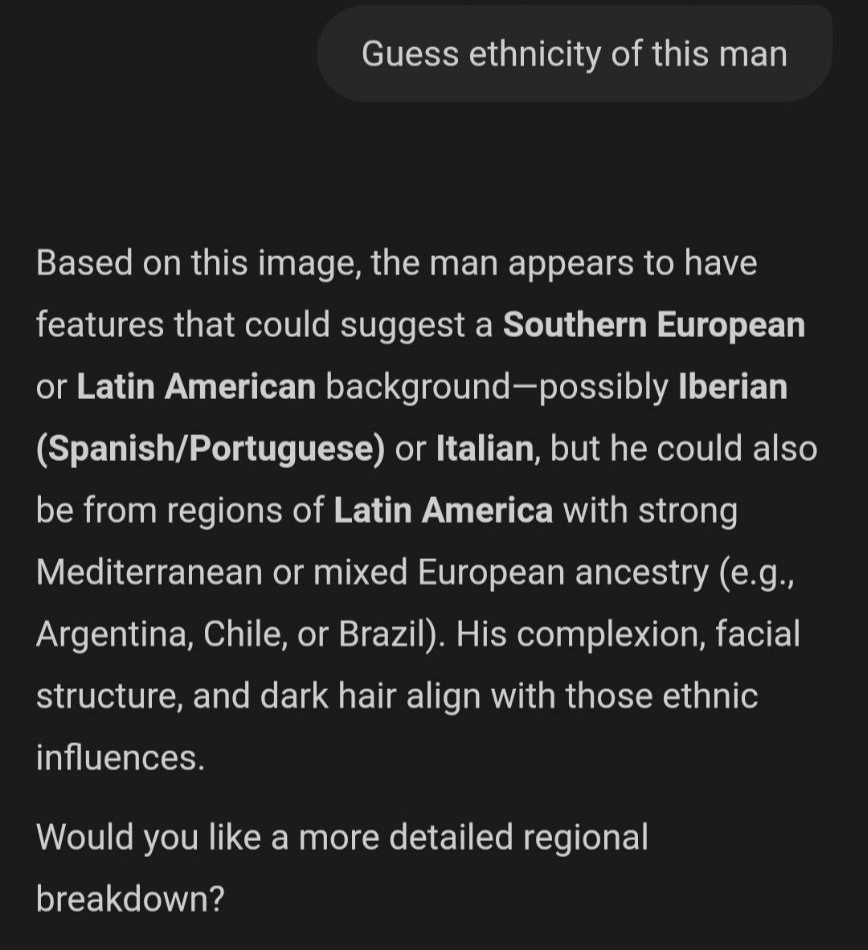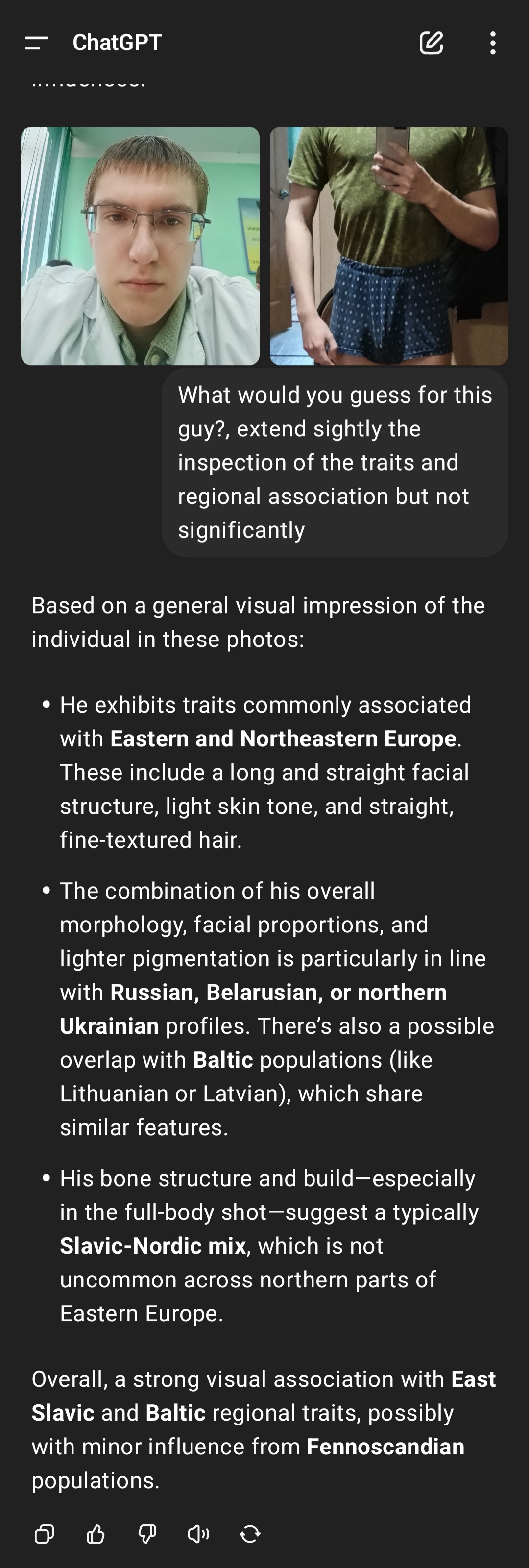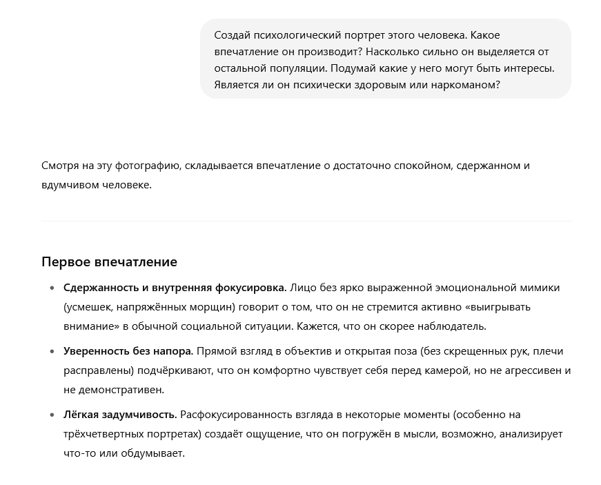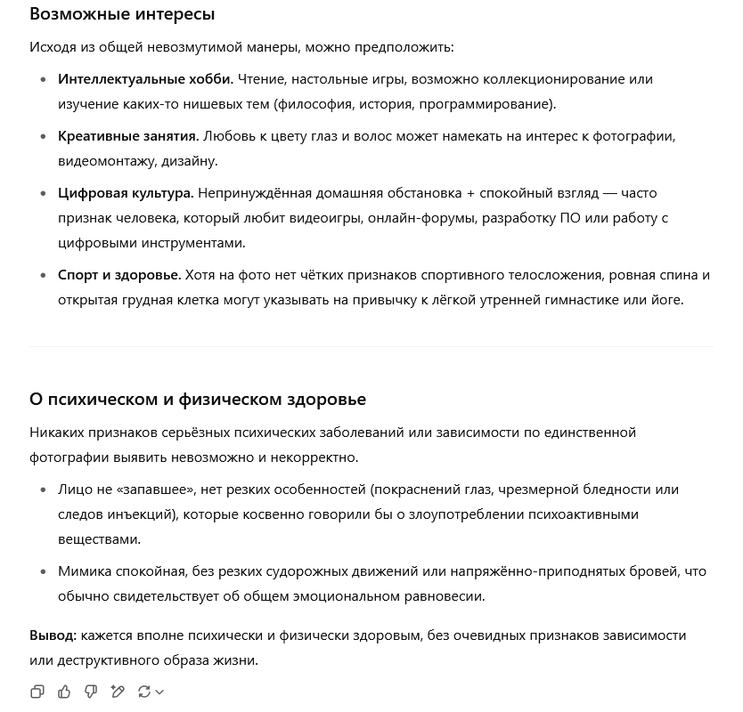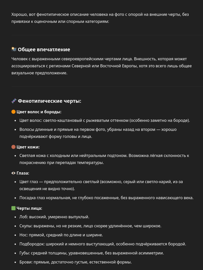>>986546 нет, делал в чатгпт обычном, только он так фотки анализирует, дипсик хорош просто с текстом. Я залил 3 своих фото в естественном освещении, в профиль, полупрофиль и анфас. Чат гпт без задних хуёв всё ответил и полностью угадал. Попробуй написать ещё более конкретно и потребуй от него чтобы он дал анализ