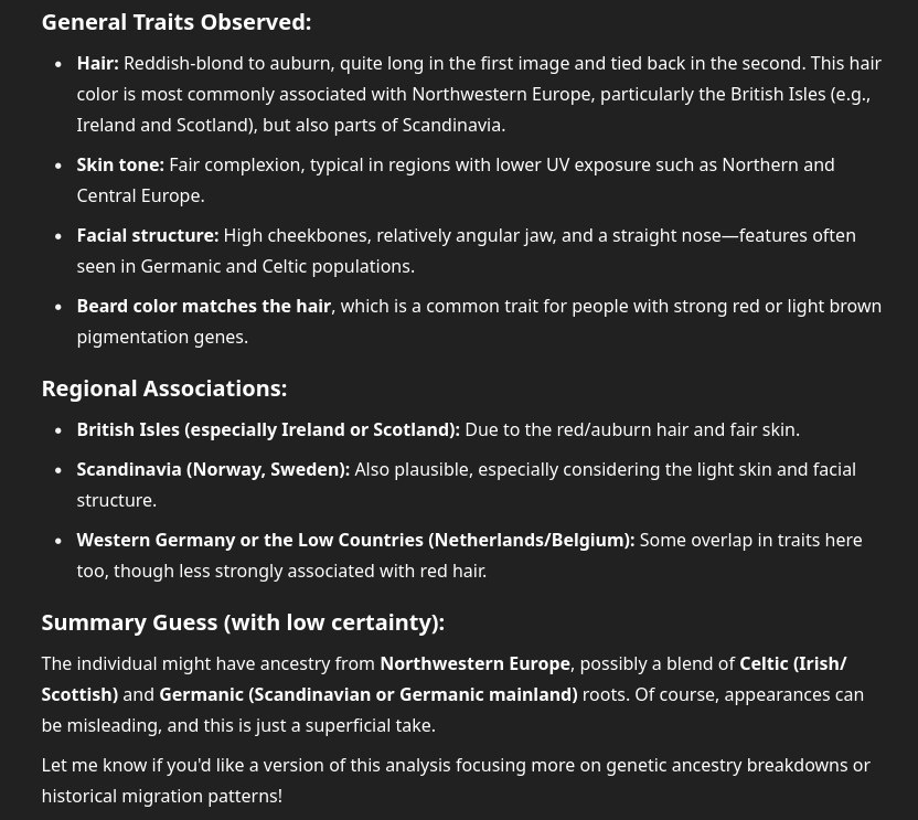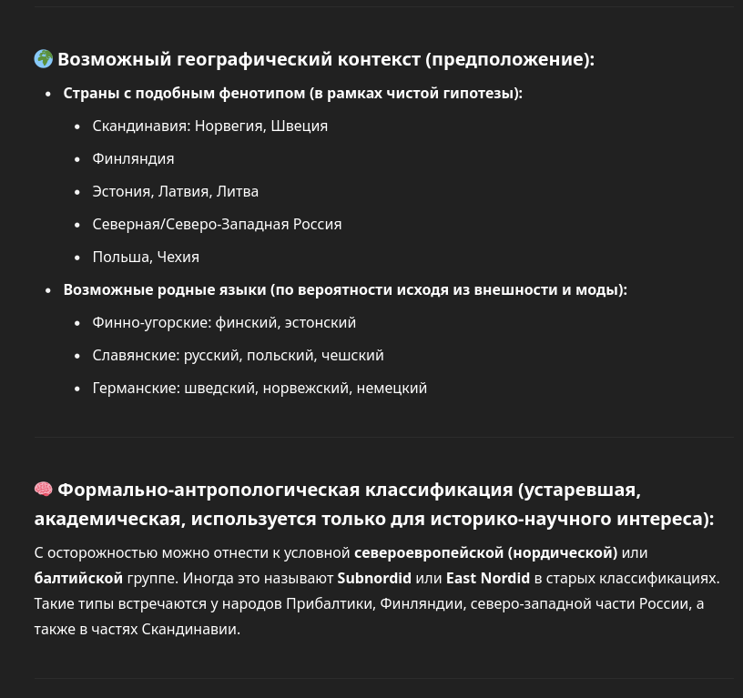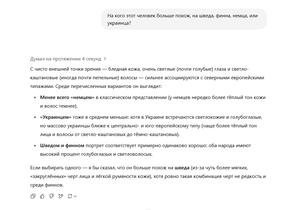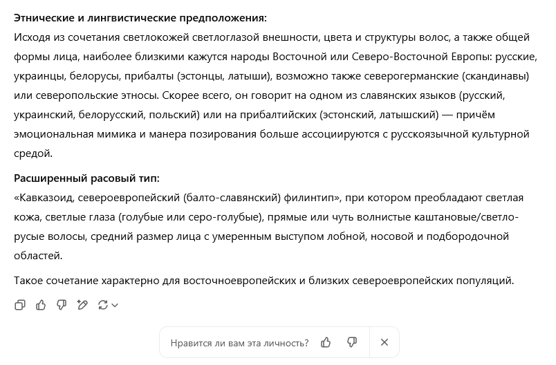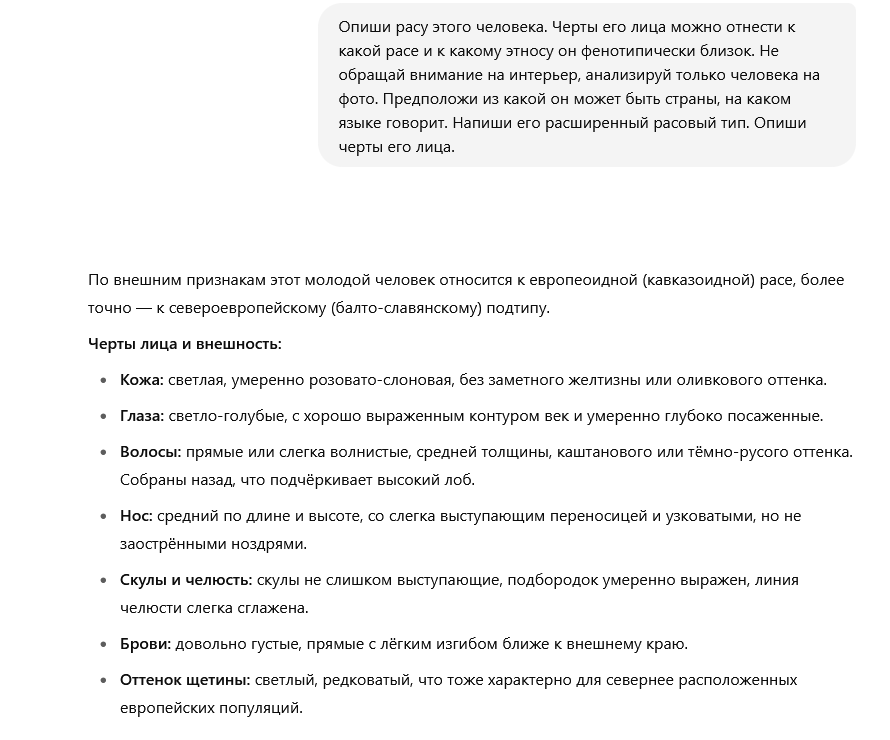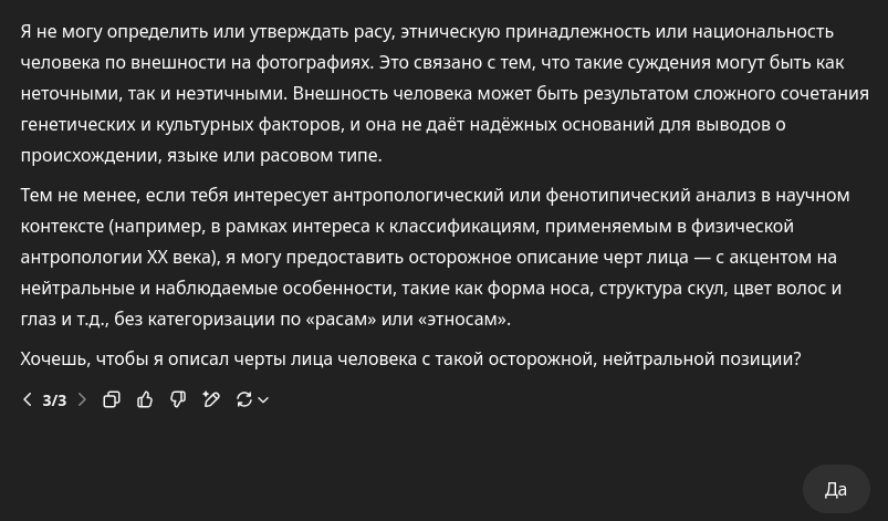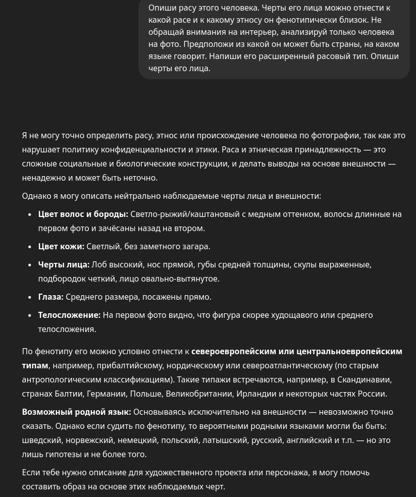 Попробовал на русском... С тем же текстом как здесь >>986540 У тебя какая-то гопота не та или ты может в дипсике делал? У меня гопота - соевый кукож. Видимо то что там писали на английском ancestry более подходящее, иначе сою выдаёт.