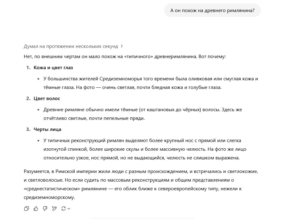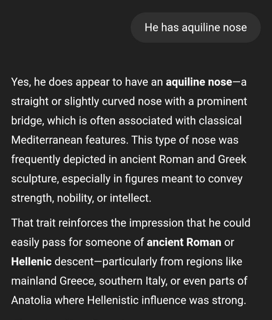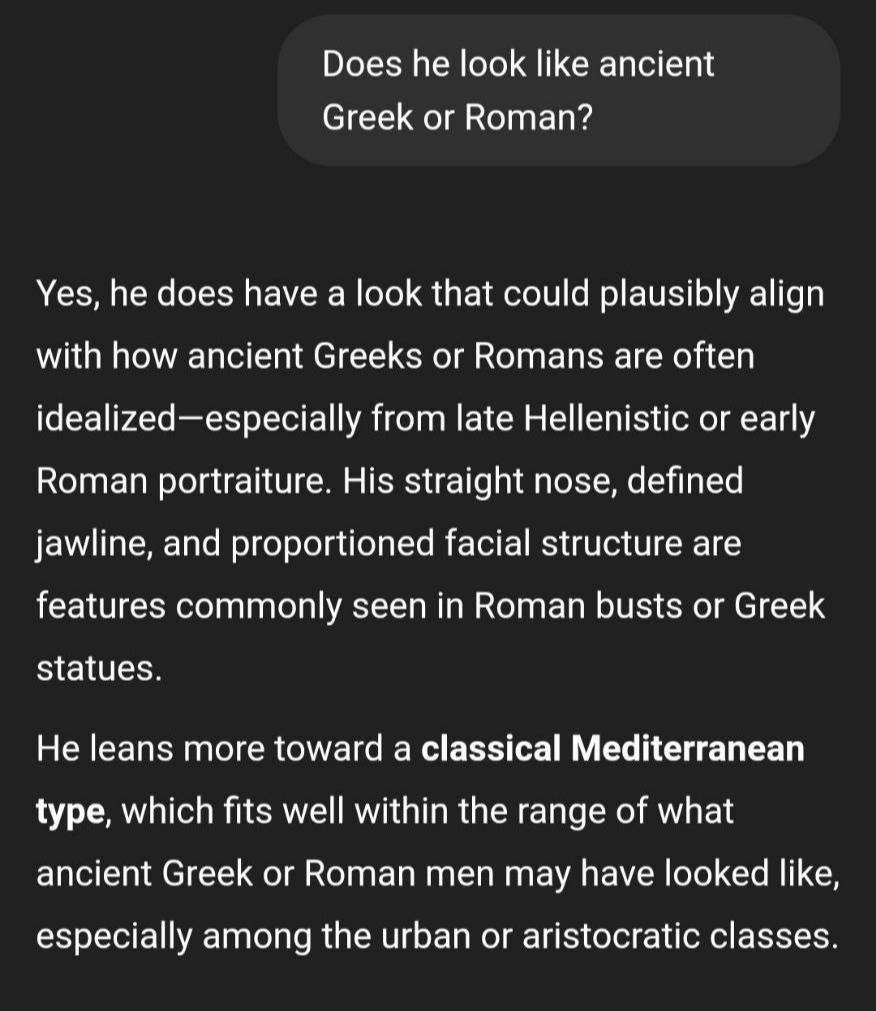 >He leans more toward a classical Mediterranean type, which fits well within the range of what ancient Greek or Roman men may have looked like, especially among the urban or aristocratic classes.