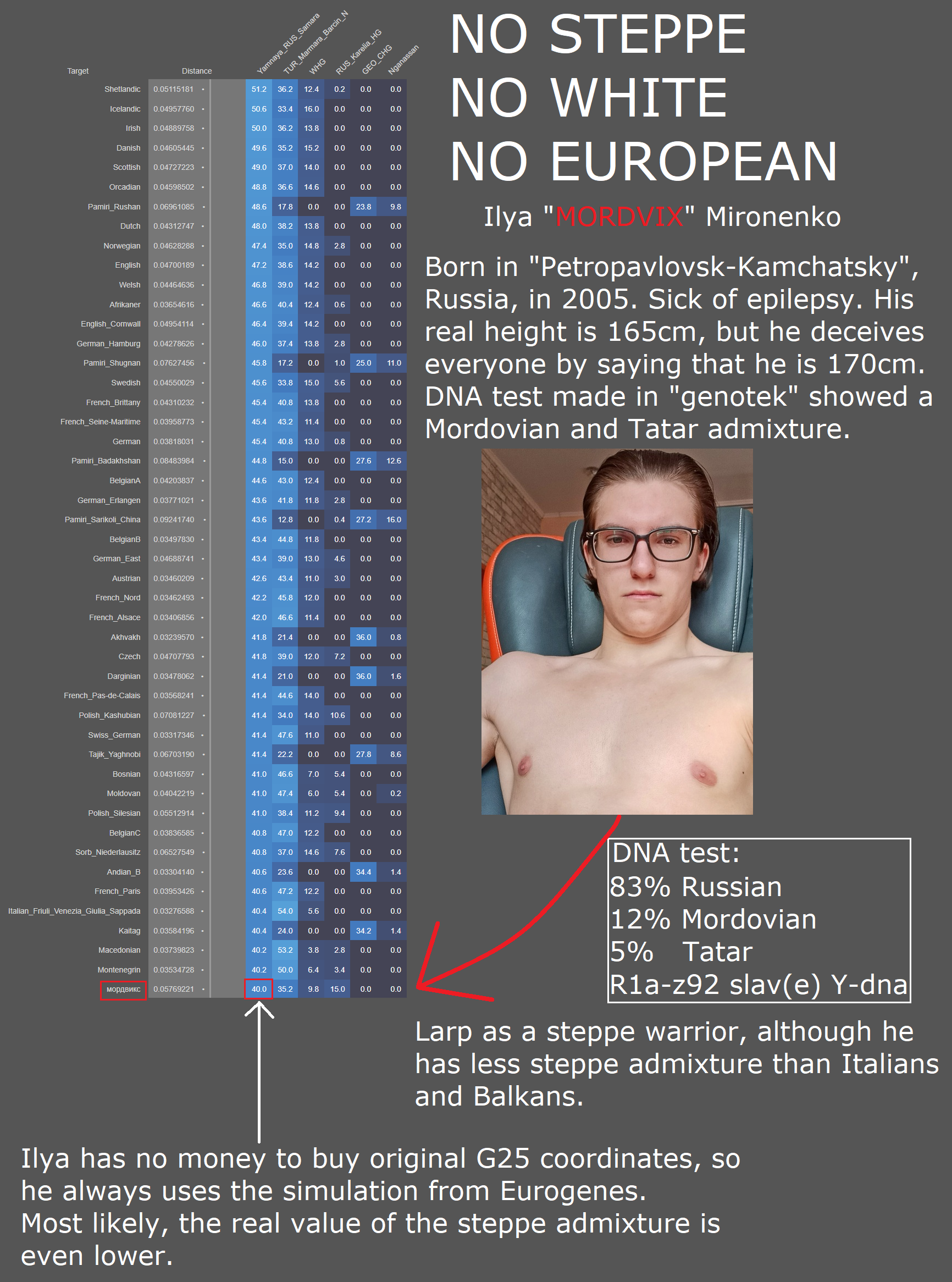 Тогда небыло известно его имя. Однажды в треде он спалил фамилию Мироненко, когда запостил скирн из вахи, где в таргете было написано PanMironenko. Позже когда треды скатились в полное безумие и никто по серьёзному с ним уже не спорил, в одном из тредов я дал ему кличку мордвикс (производные: мордвин, пердикс) и она закрепилась. Имя Илья стало известно когда он скинул мне кит от гедматча, и там он был подписан как Ilya. Спустя короткое время по запросу в гугле (Илья Мироненко из Камчатки) - выдало сайт его школы где он был в списках (гуглил не я а другой анон). Но из всей новой инфы был лишь только сырой год рождения - 2005. Пара анонов ахуели что это буквально школьник и уже никто не относился к нему серьёзно. В примерно этот промежуток времени в генотеке вышло обновление анцестрального состава, и илье приписали 12% мордвинов и 5% татар.