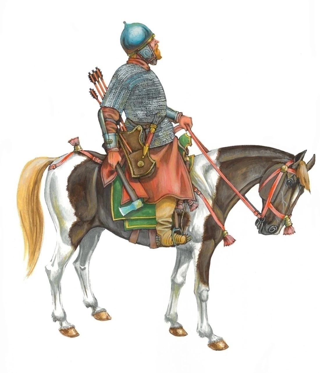 А у обычного воина лук, копье, топор, кистень и кинжал: Обыкновенное их оружие — лук, стрелы, топор (копье) и палка [наподобие (римского) цеста (coestus)], которая по-русски называется кистень (kesteni), а по-польски — бассалык (bassalick) (Это в две пяди (Spanne) деревянная рукоять, к которой прибит крепкий ремень, а на его конце привязан кусок меди, железа или оленьего рога; ремень также длиной почти в полторы пяди.) Саблю употребляют те, кто [познатнее и] побогаче.