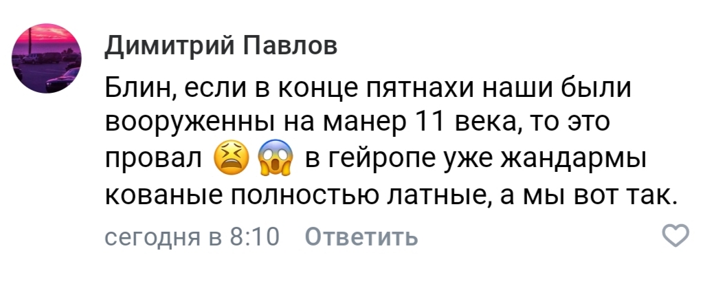 >>999671 Конечно, он же нормальный специалист по русскому костюму, униформе и вооружению 17-18 веков, а не какой-нибудь двачер, который годами срет в этих тредах своими скотскими фантазиями про тяжёлых латных новгородичей