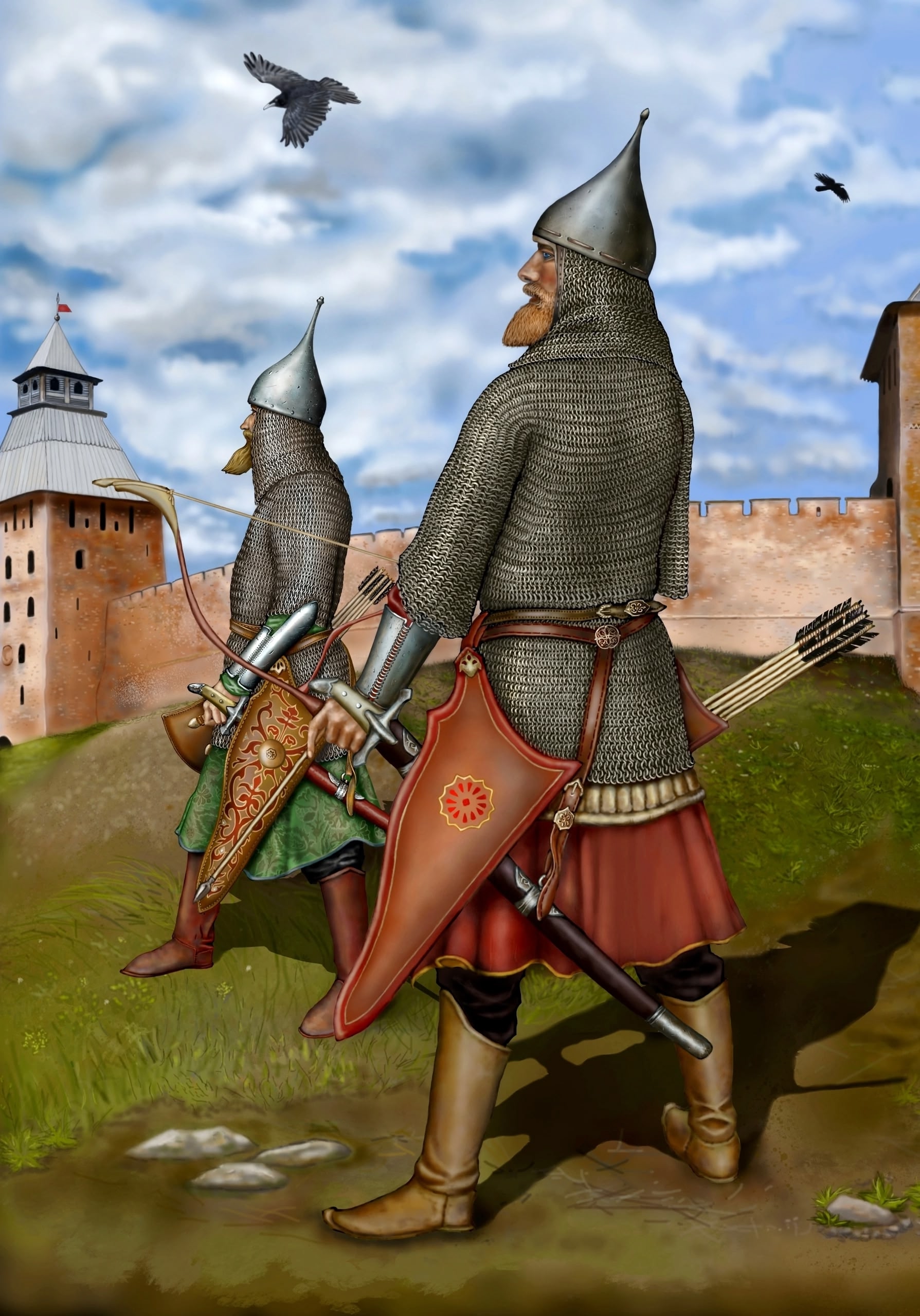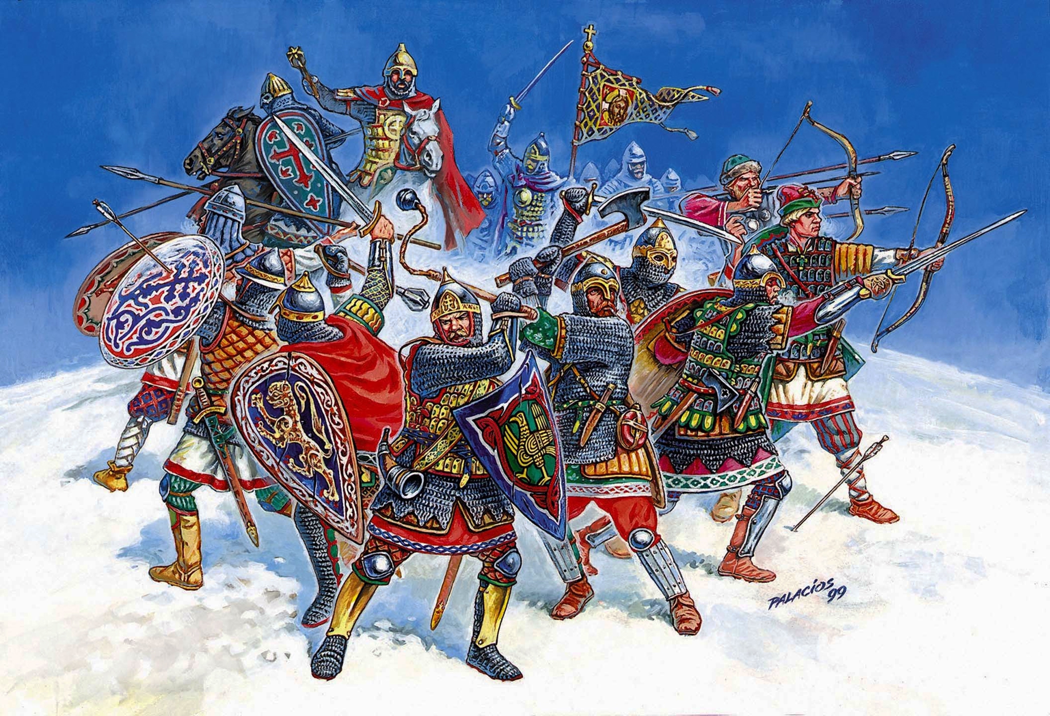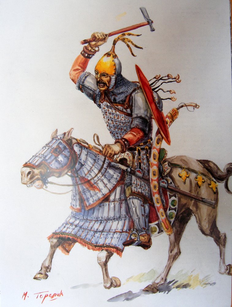 А пока отметим, что самые массивные доспехи средневековой Европы делали только новгородские, смоленские и псковские умельцы. Сработанные ими латы весили не менее четырех пудов, поэтому витязю требовался необычайно выносливый огромный конь и особые рыцарские шпоры, которыми, по мнению профессора А. В. Арциховского, «можно было пришпорить коня сквозь густую кольчугу и даже, может быть, сквозь латы».