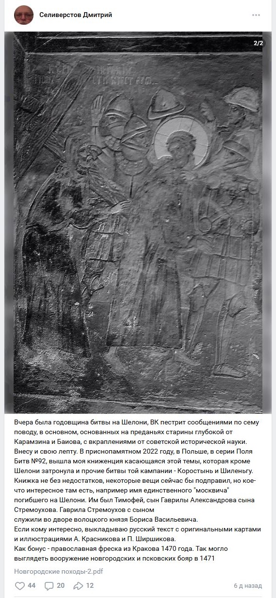 Троллингом я вообще не никогда не занимался и не знаю что это такое. Все что я пишу на 99% основывается только на исторических фактах и источниках, которые можно интерпретировать совершенно по-разному, например можно отмечать наличие элементов латных доспехов у м. на всех трех изо Битвы под Орщей (латные полудоспехи с прорисованными налокотниками на гравюре Крицкого 1515 года, 3 пары разного вида европейских латных наплечников у м. на картине битва под Оршей, оказавшихся среди референсов художника среди пары предоставленных ему м. шеломов, бехтерцов и зерцал, а также полные латные доспехи у м. на гравюре Бельского 1564 года), но не говорить всей правды. Заметь, я никогда не писал что все м. легкие лучники или латники, я всего лишь выпячиваю одну сторону военного дела м. в зависимости от настроения и постулата что история это не наука, а искусство нести правдоподобный полубред, как какой-нибудь Арсений Зеленцов. Причем этим занимаются все историки и любой факт можно опорочить и разъебать за 3 секунды, например сказать что короткая кольчужка была доминирующим доспехом у подавляющего большинства польской конницы 11-17 веков и что латы и полулаты в Польше даже близко не вытеснили короткую кольчужку в коннице как это произошло в Западной Европе, и что латный доспех в Польше был маргинальным видом защиты узкой прослойки богатого дворянства среди всего войска, как немецко-французское платье 2% русских дворян среди всего русского народа в кафтанах.
