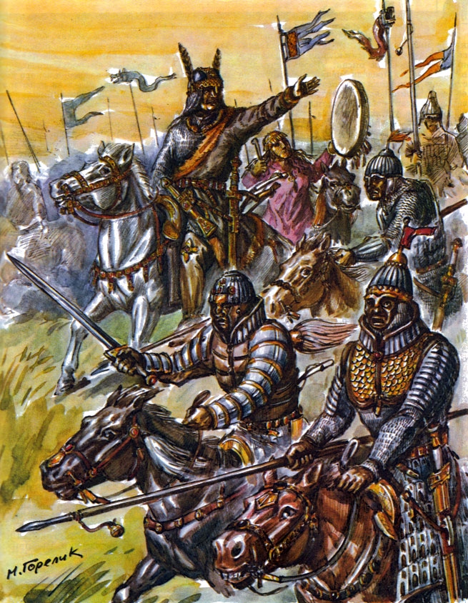 Ну, а сколько было русичей — вряд ли о том кто и ведал доподлинно. По тем временам по тогдашнему населению городов огромная то была рать! И мужикам, сошедшим из укромных маленьких деревень, вообще казавшаяся безмерной! Впервые со времен уделов, со времен Мономаха почитай, впервые собиралась на Руси воедино такая громада войска! Тут, как ни считай, и двести, и четыреста тысяч сказать мочно — глазом не обозреть!