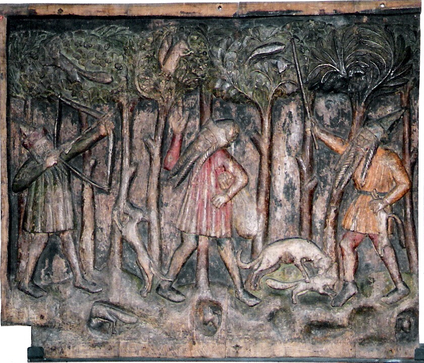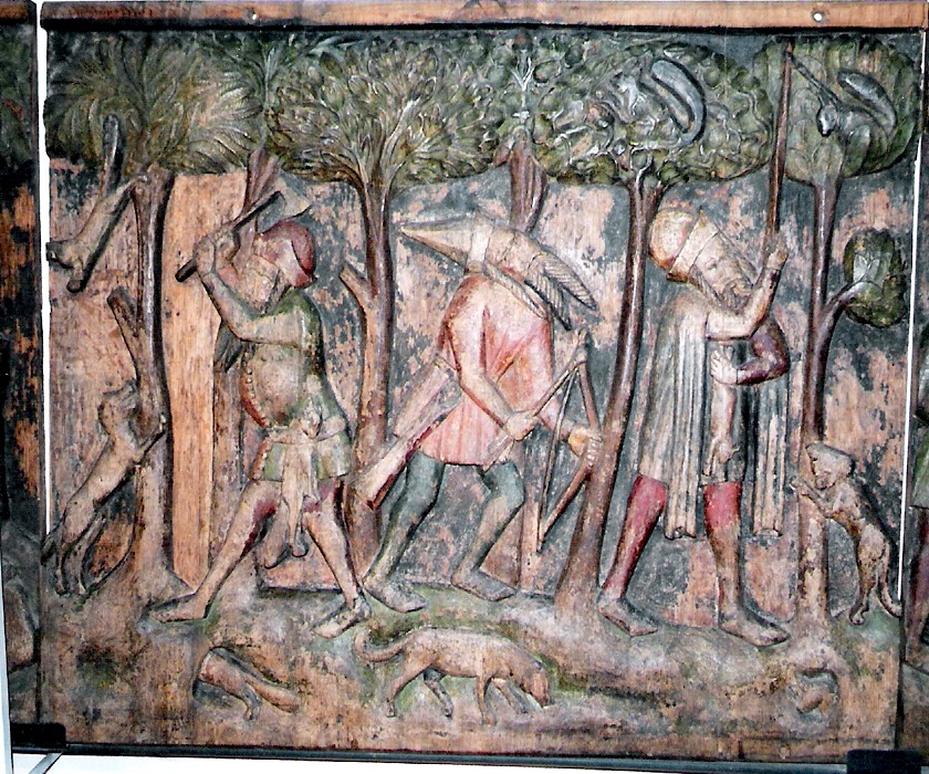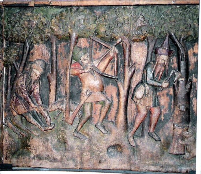 Новгородцы предлагают свой товар (меха белки) приказчику подворья Святого Петра в Риге. Резная панель из церкви Святого Николая в Штральзунде. Около 1360 года