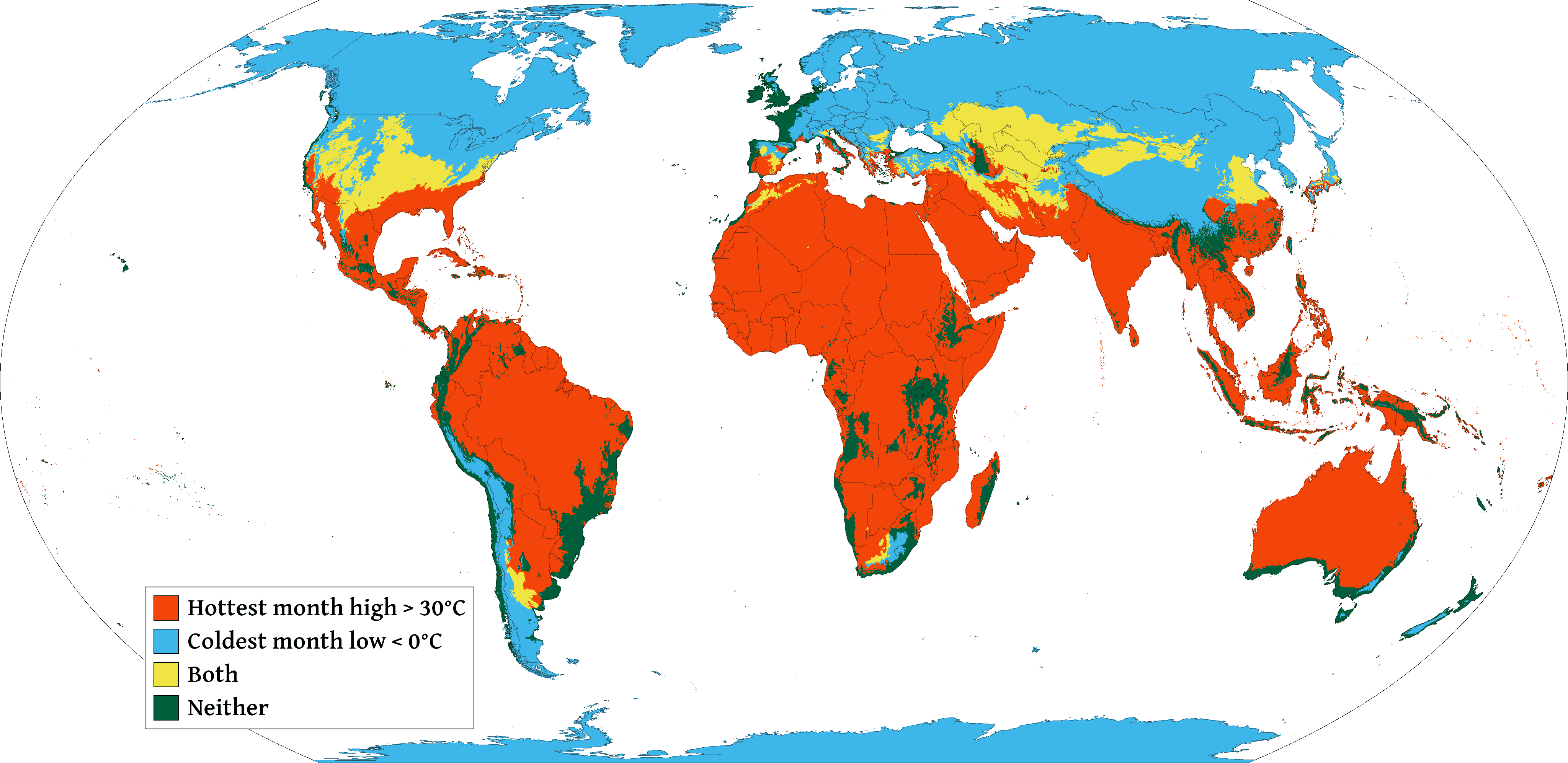 >>997277 Минимум и максимум это не средние показатели опять же. Если карта>>997242 ссылается на минимумы и максимумы, то большая часть Евразии должна быть в желтой зоне, опять же. Везде есть заморозки, и везде иногда бывает +30.