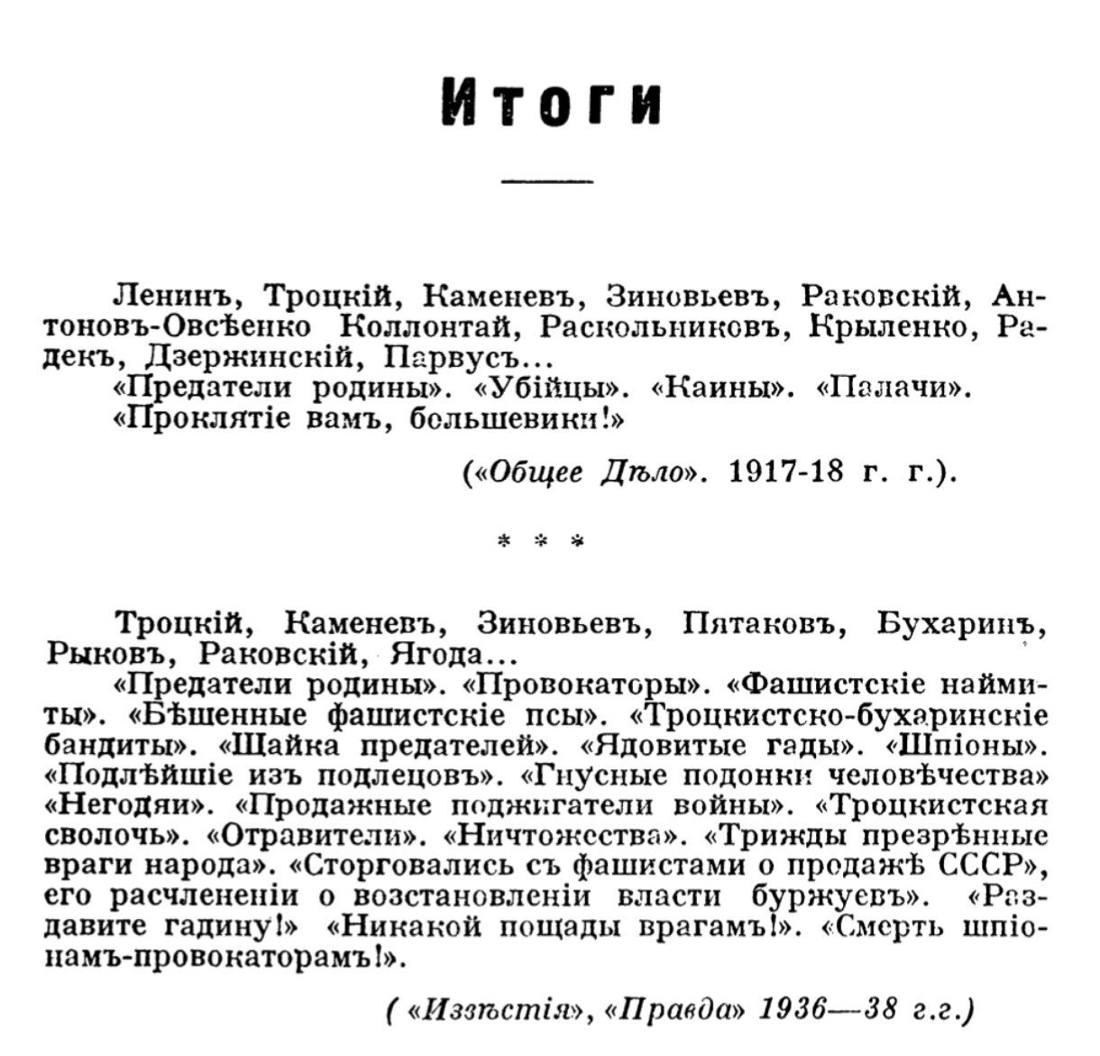 В 1938 г. эмигрант В. Л. Бурцев сравнил: что он писал про большевиков в 1917-1918 гг. на страницах газеты "Общее дело", и что спустя 20 лет пишут о них советские газеты.